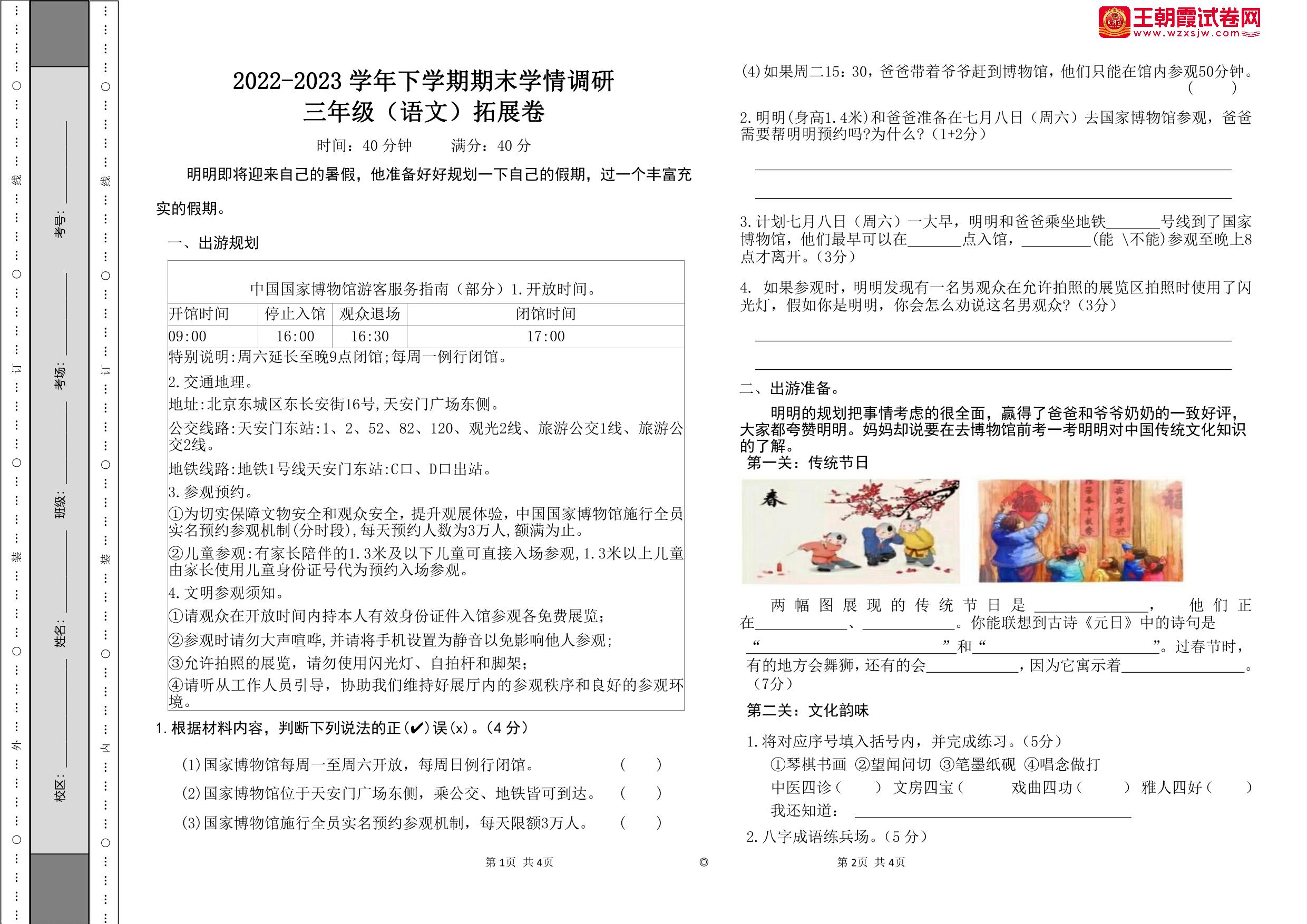 河南省郑州陈中实验学校2022—2023学年下学期期末学情调研拓展试卷三年级语文(人教版)