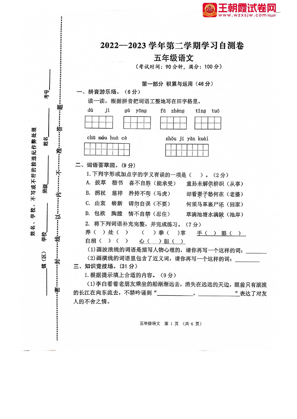 河南省安阳市汤阴县2022—2023学年下学期期末学习自测卷五年级语文(人教版)