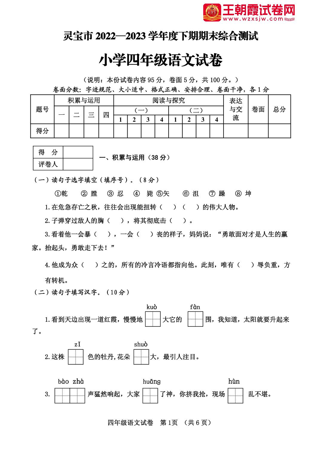 河南省三门峡市灵宝市2022—2023学年下学期期末综合测试四年级语文(人教版)