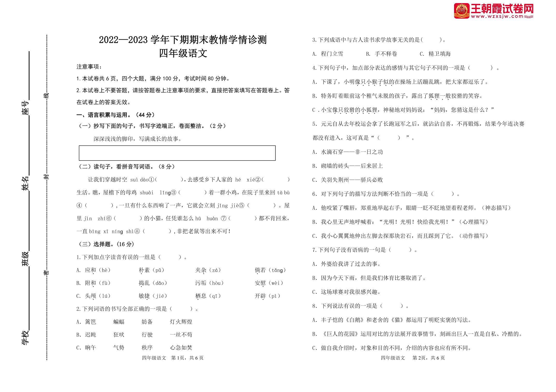 河南省三门峡市陕州区2022—2023学年下学期期末教情学情诊测试题四年级语文(人教版)