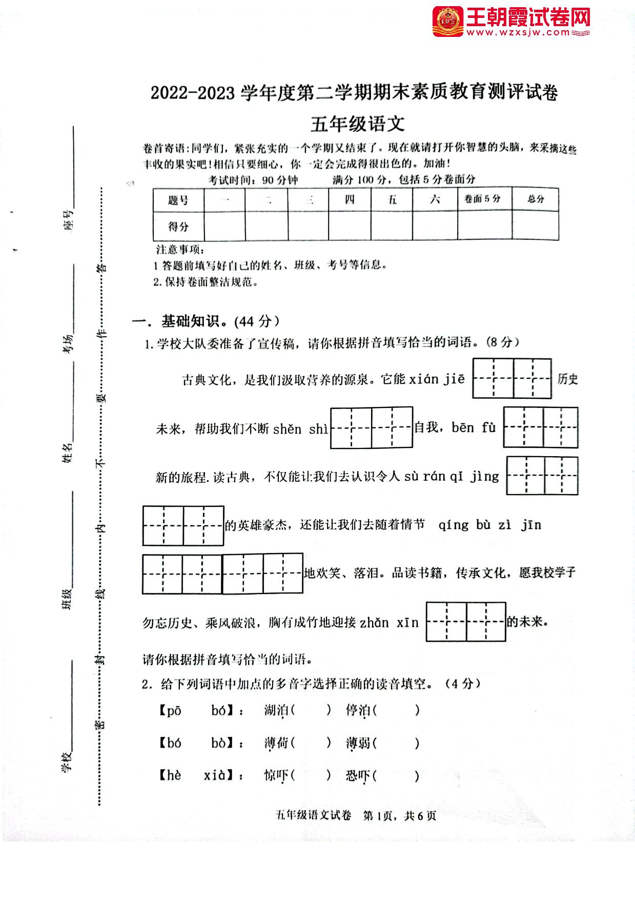 河南省周口市项城市2022—2023学年下学期期末素质教育测评试卷五年级语文(人教版)