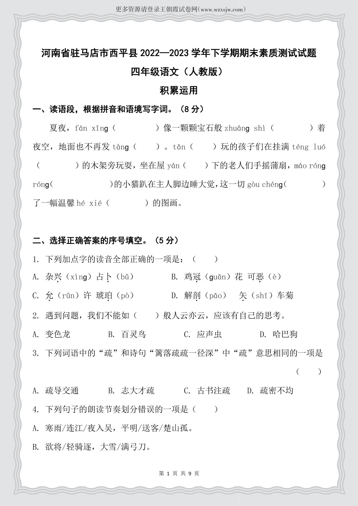 河南省驻马店市西平县2022—2023学年下学期期末素质测试试题四年级语文(人教版)