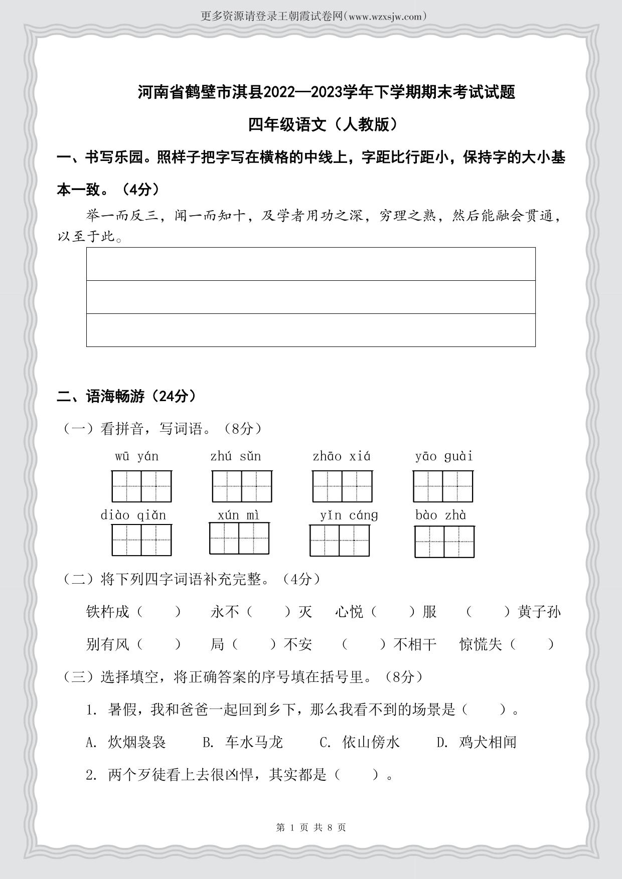 河南省鹤壁市淇县2022—2023学年下学期期末考试试题四年级语文(人教版)