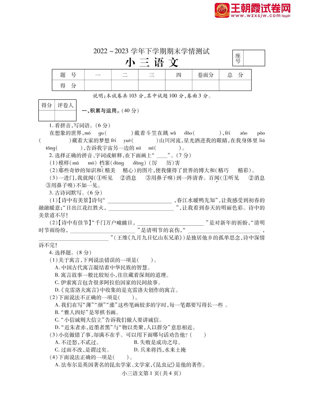 三年级语文人教版下册期末卷