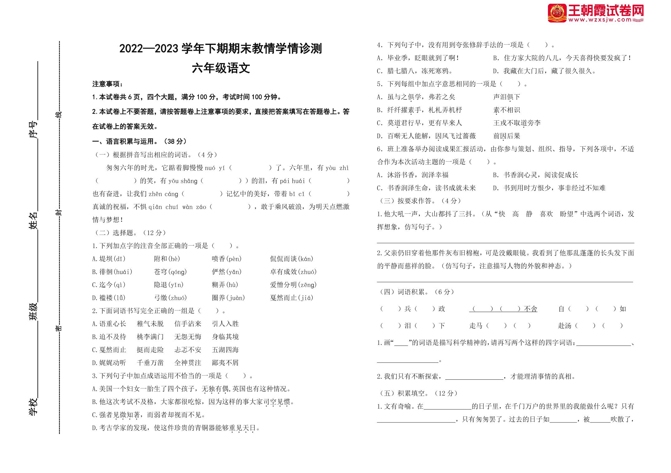 河南省三门峡市陕州区2022—2023学年下学期期末教情学情诊测试题六年级语文(人教版)