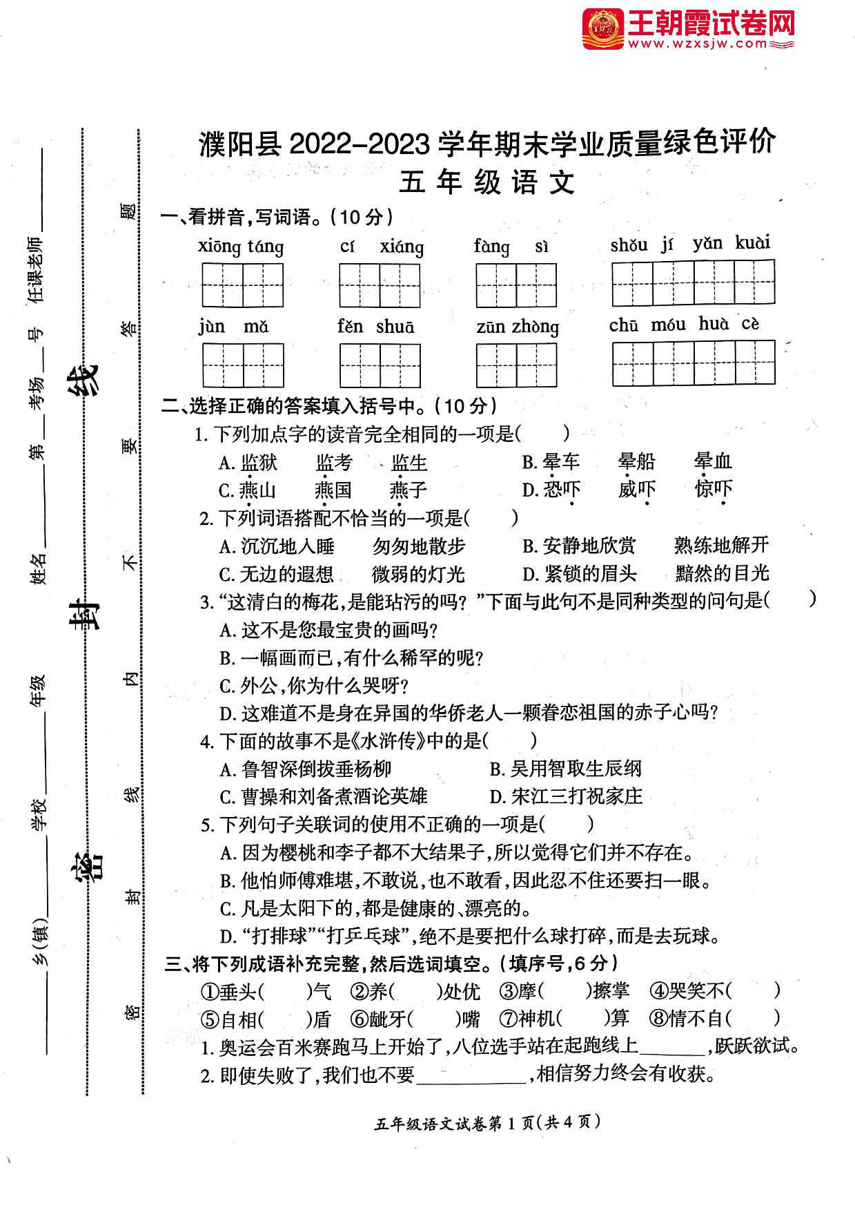 河南省濮阳市濮阳县2022—2023学年下学期期末学业绿色评价试题五年级语文(人教版)