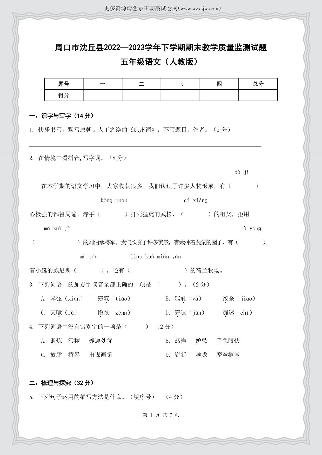 河南省周口市沈丘县2022—2023学年下学期期末教学质量监测试题五年级语文(人教版)