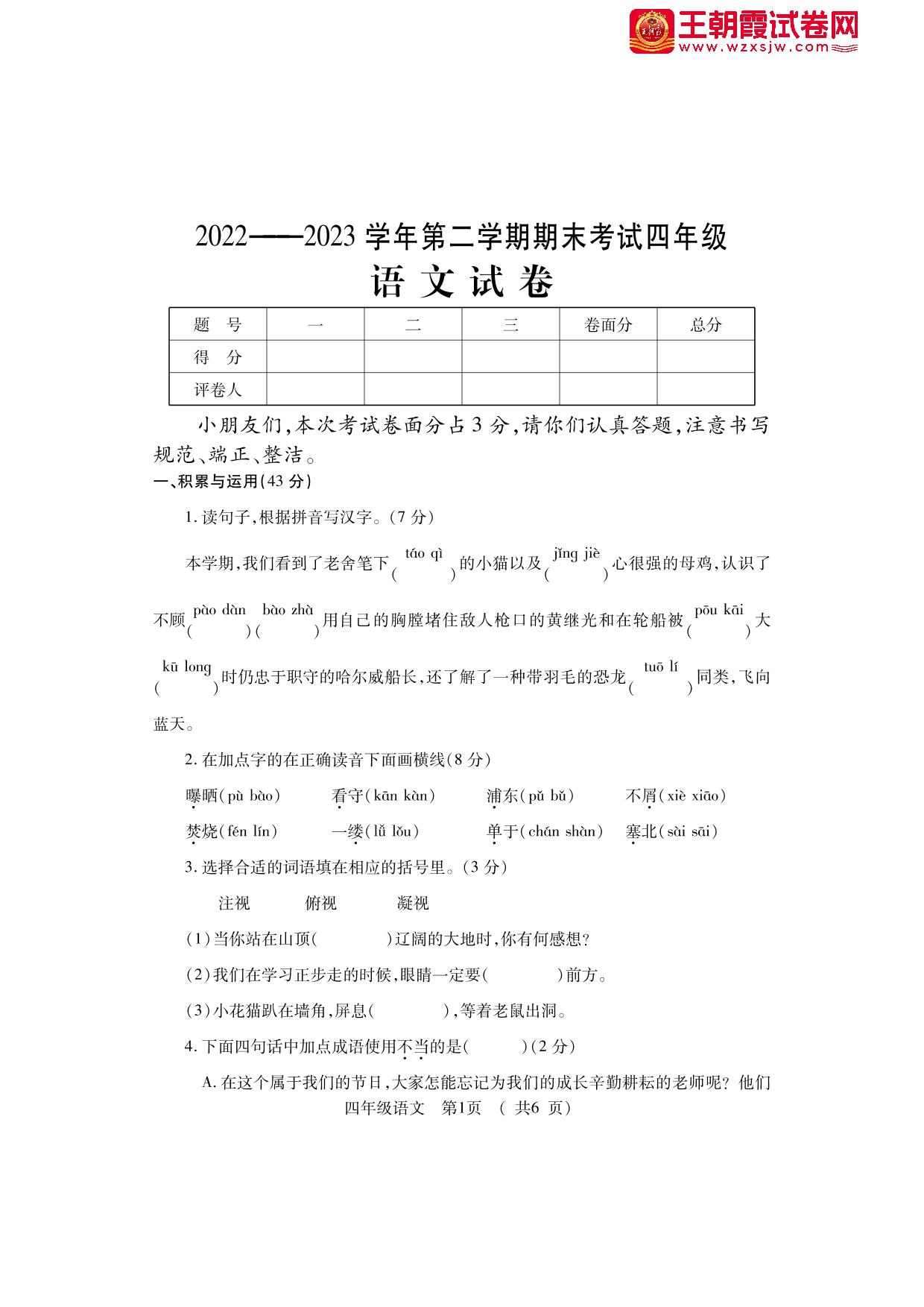 河南省洛阳市嵩县2022—2023学年下学期期末考试试题四年级语文(人教版)