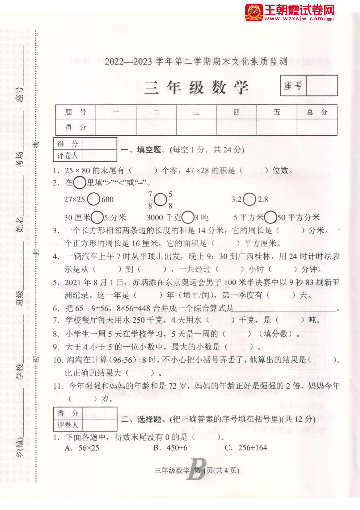 三年级数学苏教版下册期末卷