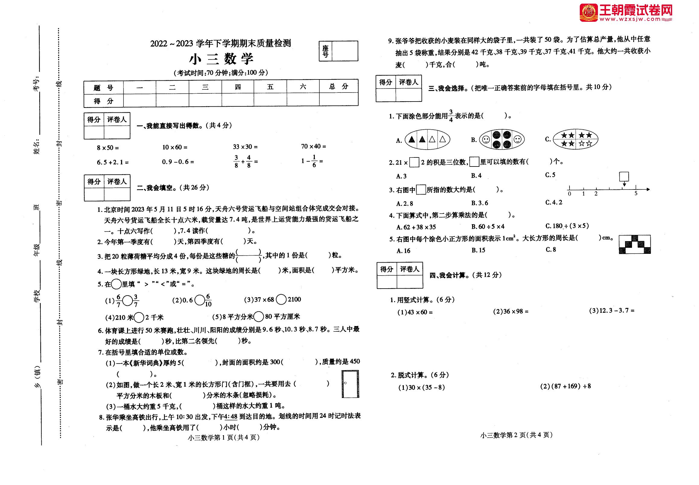 河南省平顶山市汝州市2022—2023学年下学期期末质量检测三年级数学(苏教版)