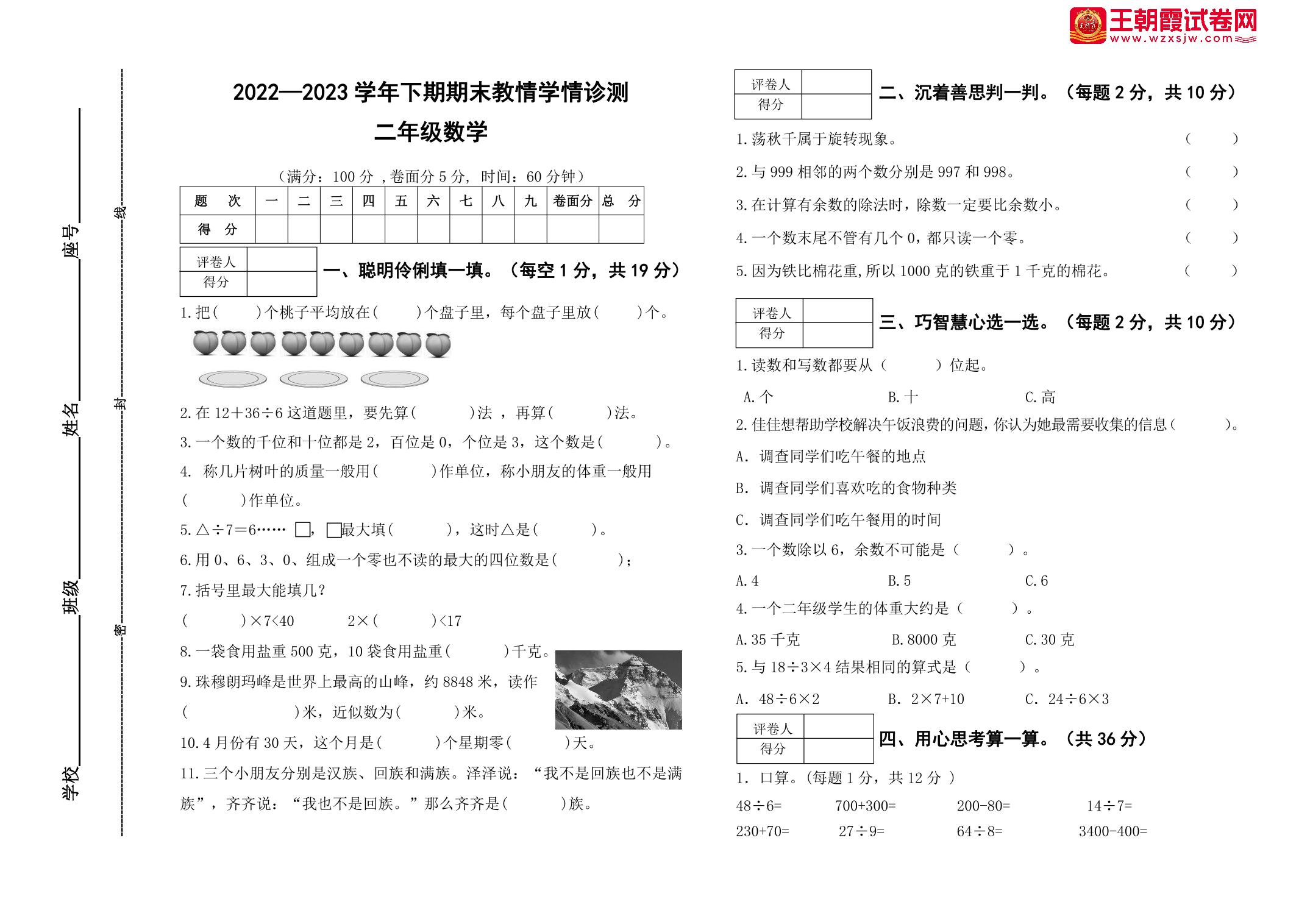 河南省三门峡市陕州区2022—2023学年下学期期末教情学情诊测二年级数学(人教版)