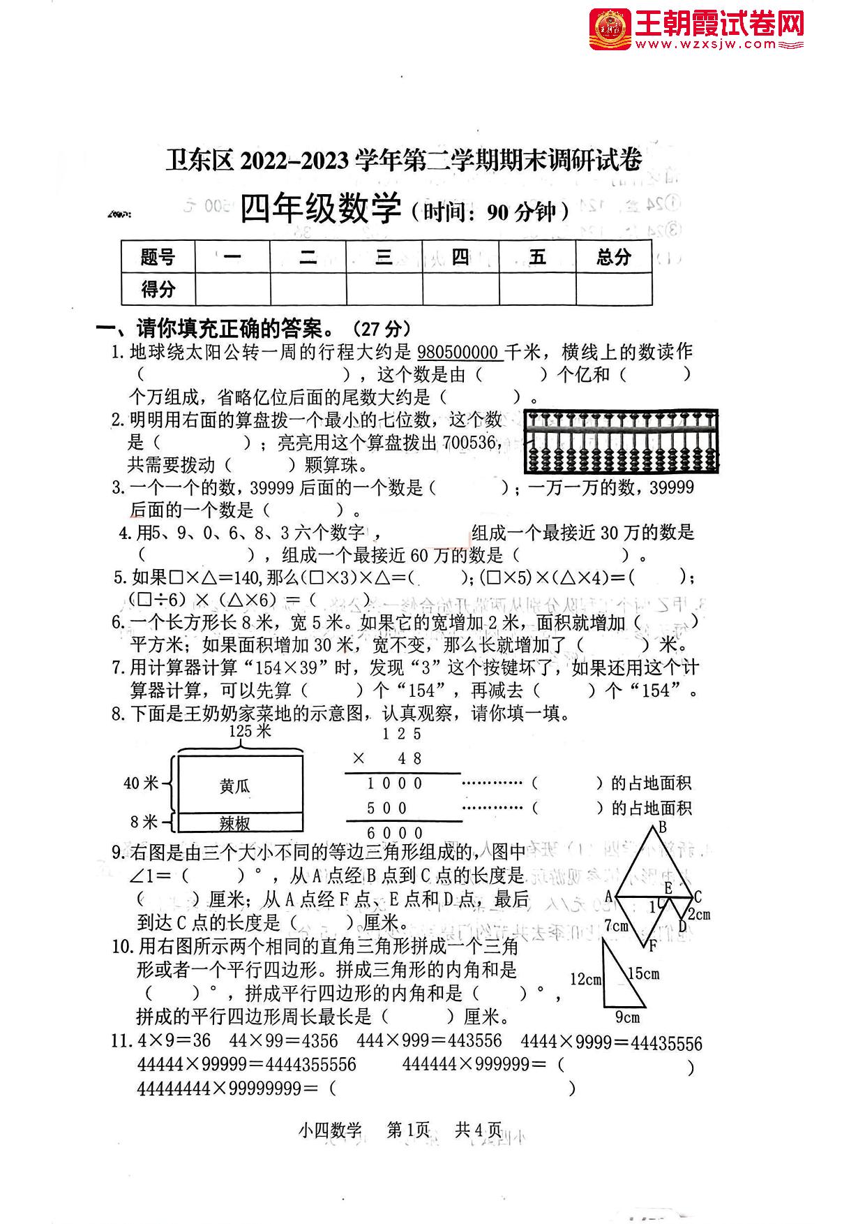 河南省平顶山市卫东区2022—2023学年下学期期末调研试卷四年级数学(苏教版)