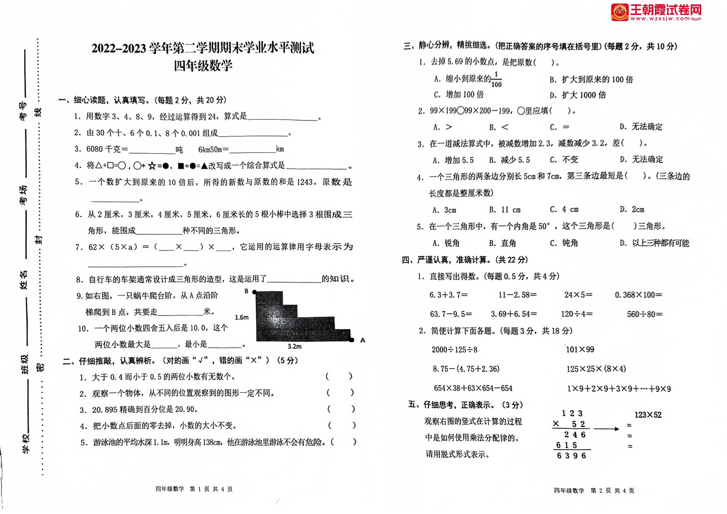 河南省开封市杞县2022—2023学年下学期期末学业水平测试四年级数学(人教版)