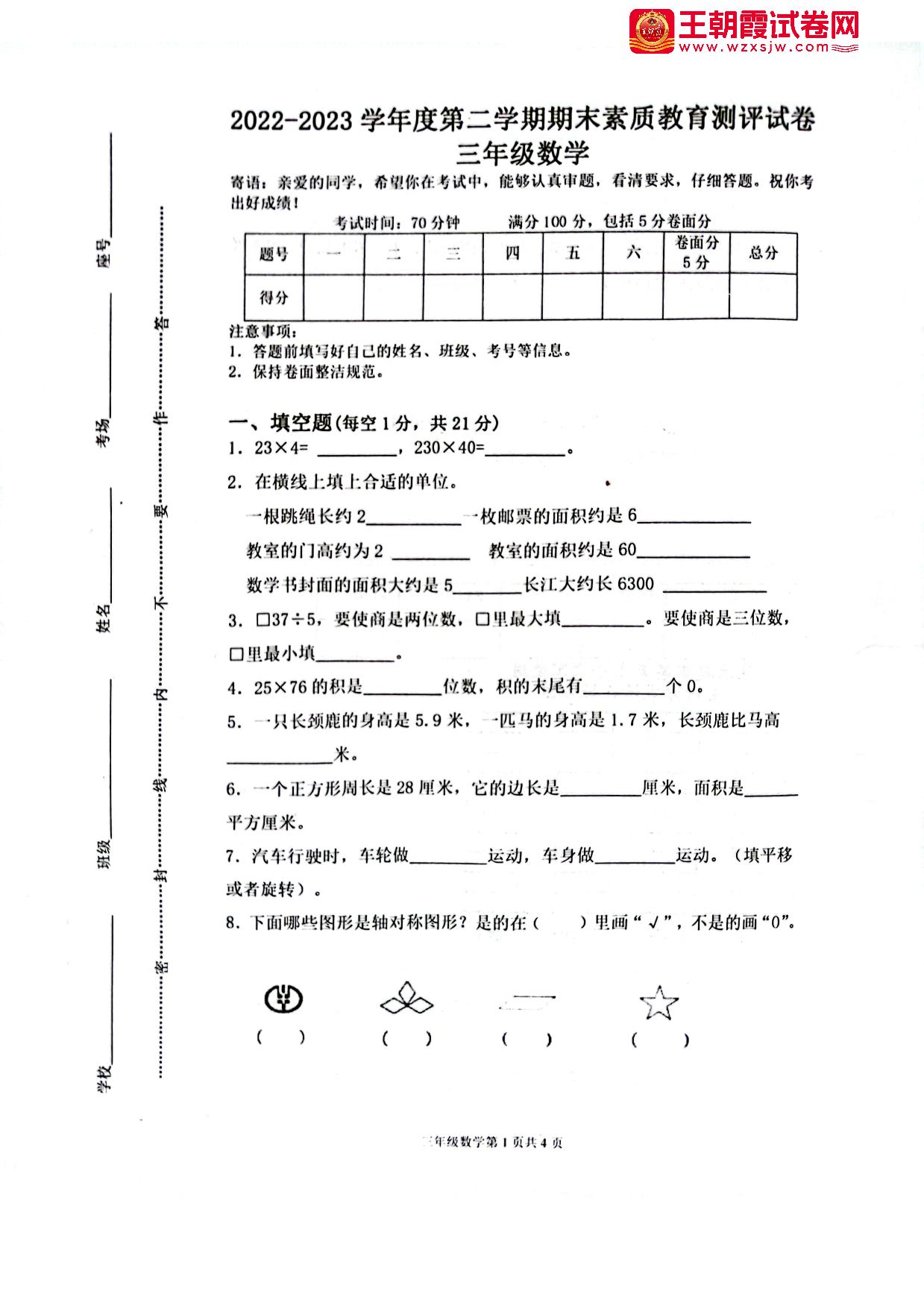 河南省周口市项城市2022—2023学年下学期期末素质教育测评试卷三年级数学(西师版)