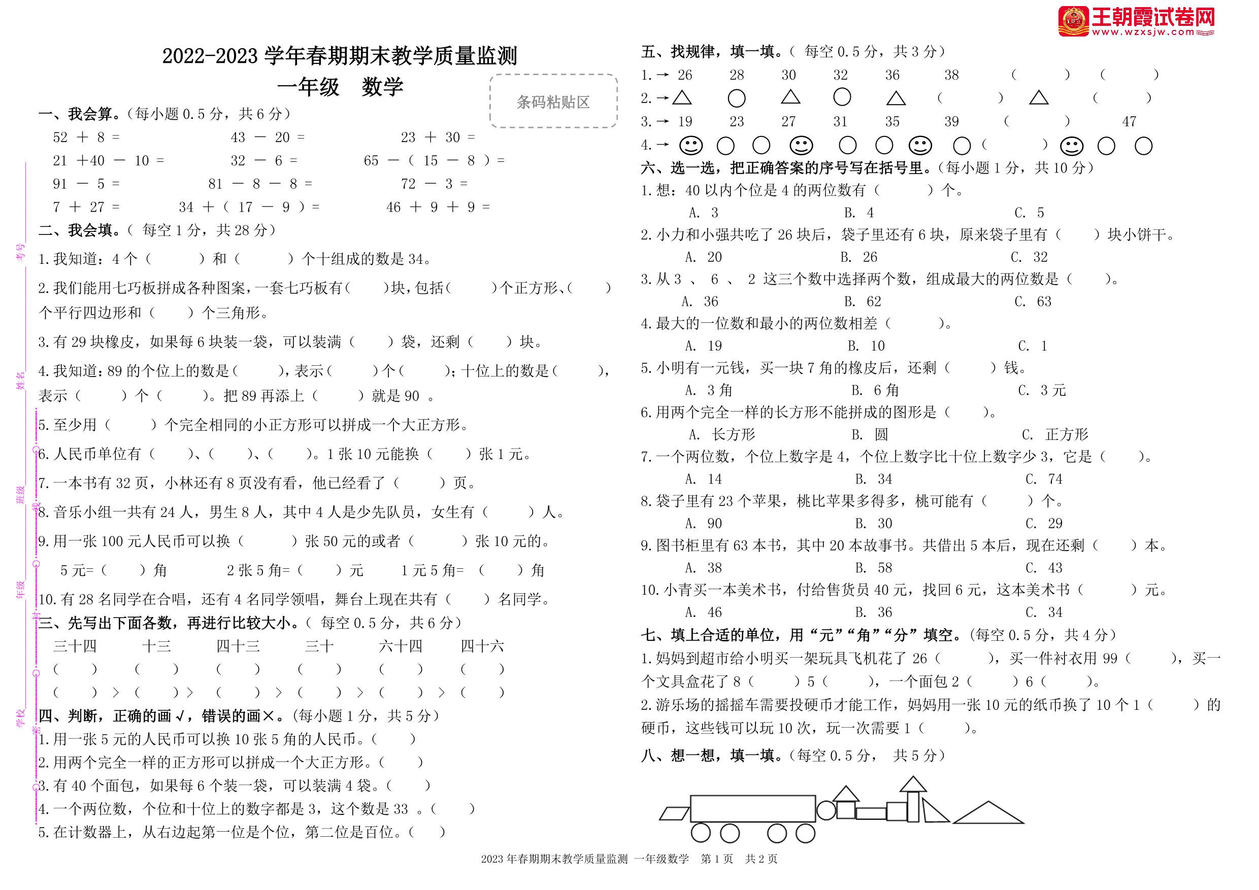 河南省驻马店市确山县2022—2023学年下期期末教学质量监测一年级数学(人教版)
