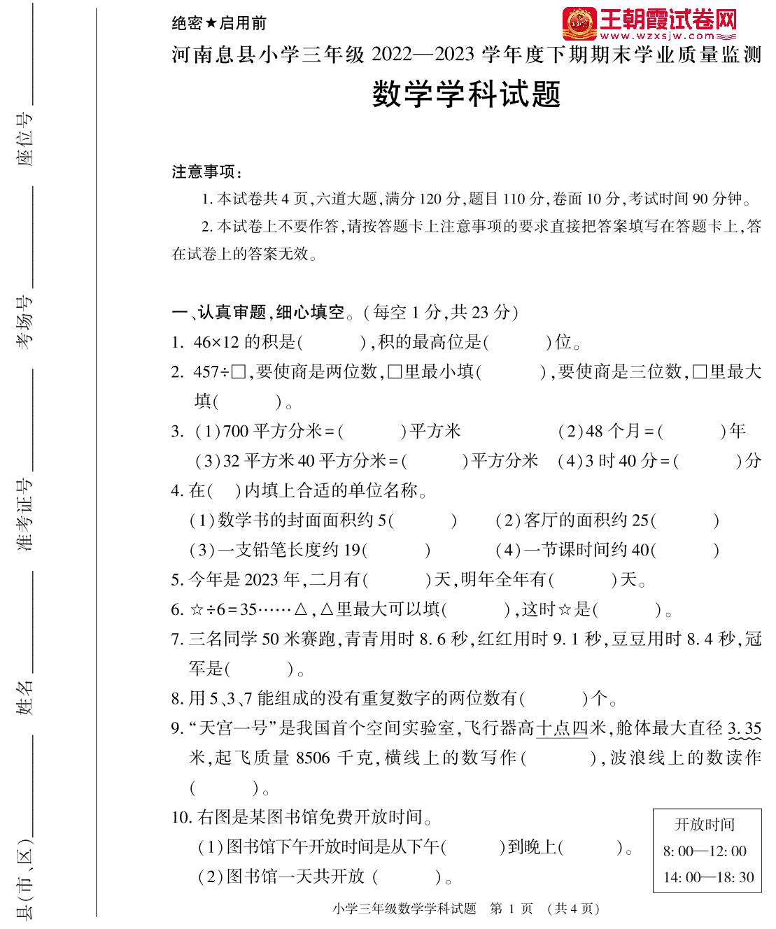 河南省信阳市息县2022—2023学年下学期期末学业质量监测试题三年级数学(人教版)