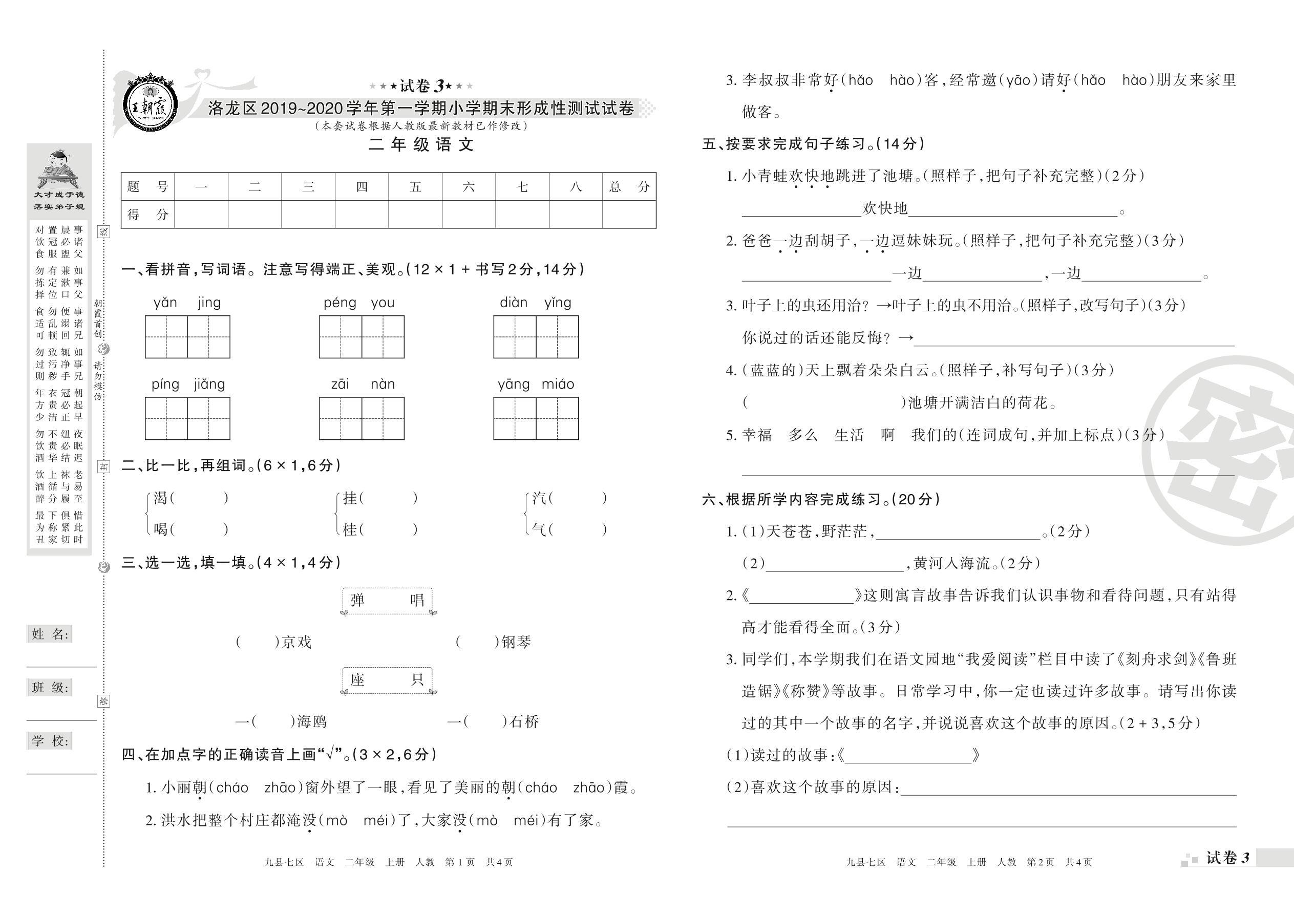 2019-2020学年第一学期洛阳市洛龙区二年级语文试卷(人教版)【3】