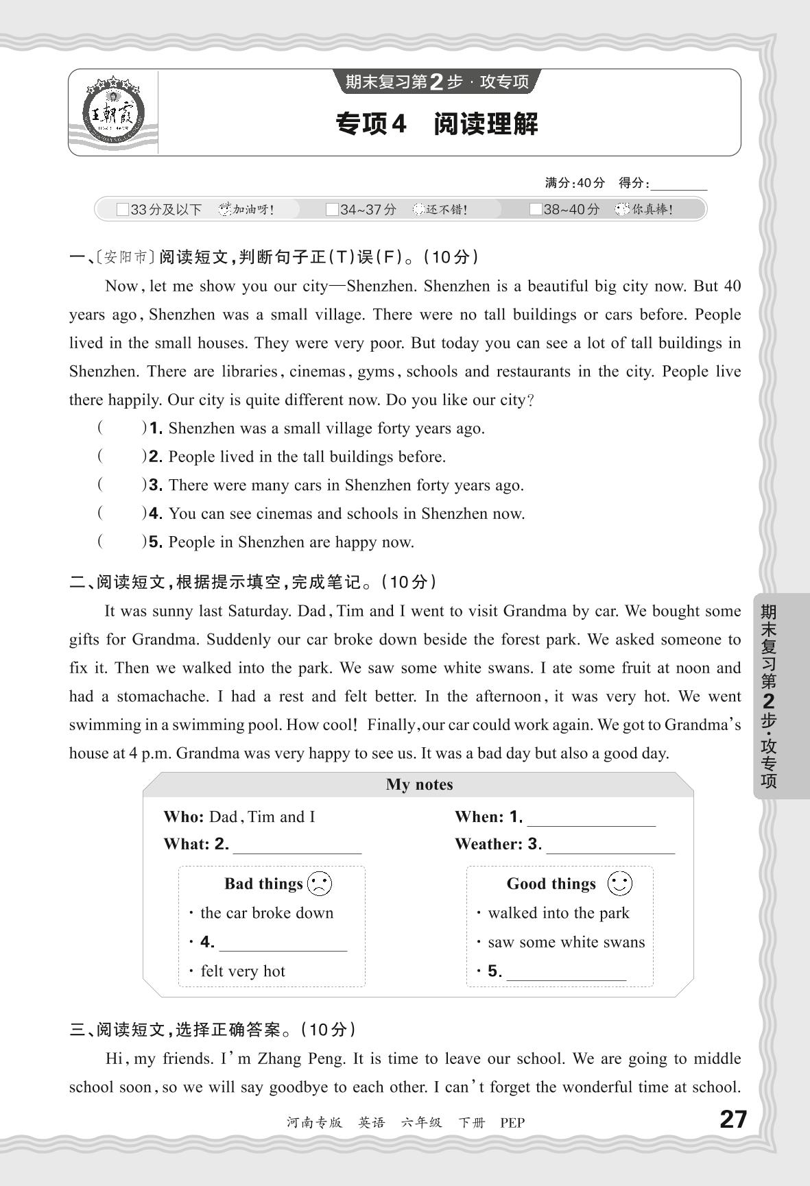 2024春下册六年级英语人教PEP版 期末专项卷河南版·阅读理解