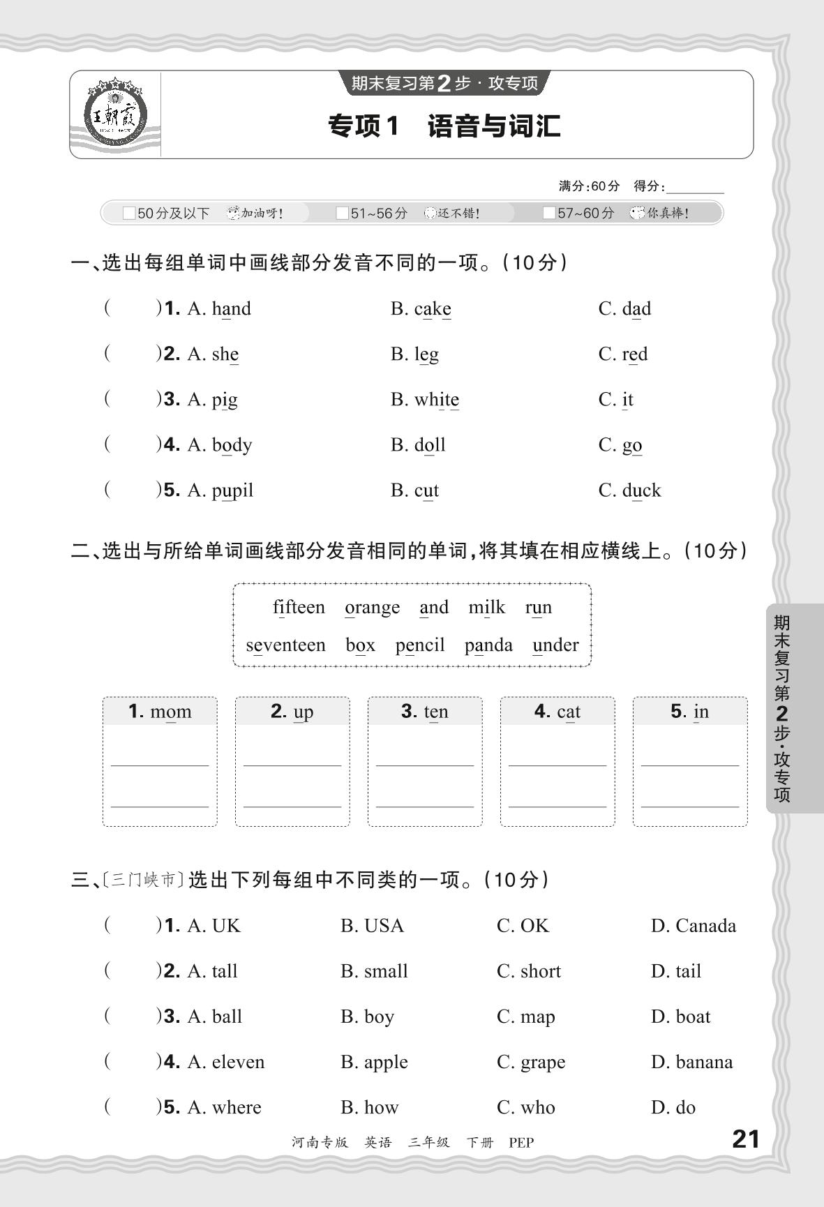 2024春下册三年级英语人教PEP版 期末专项卷河南版·语音与词汇