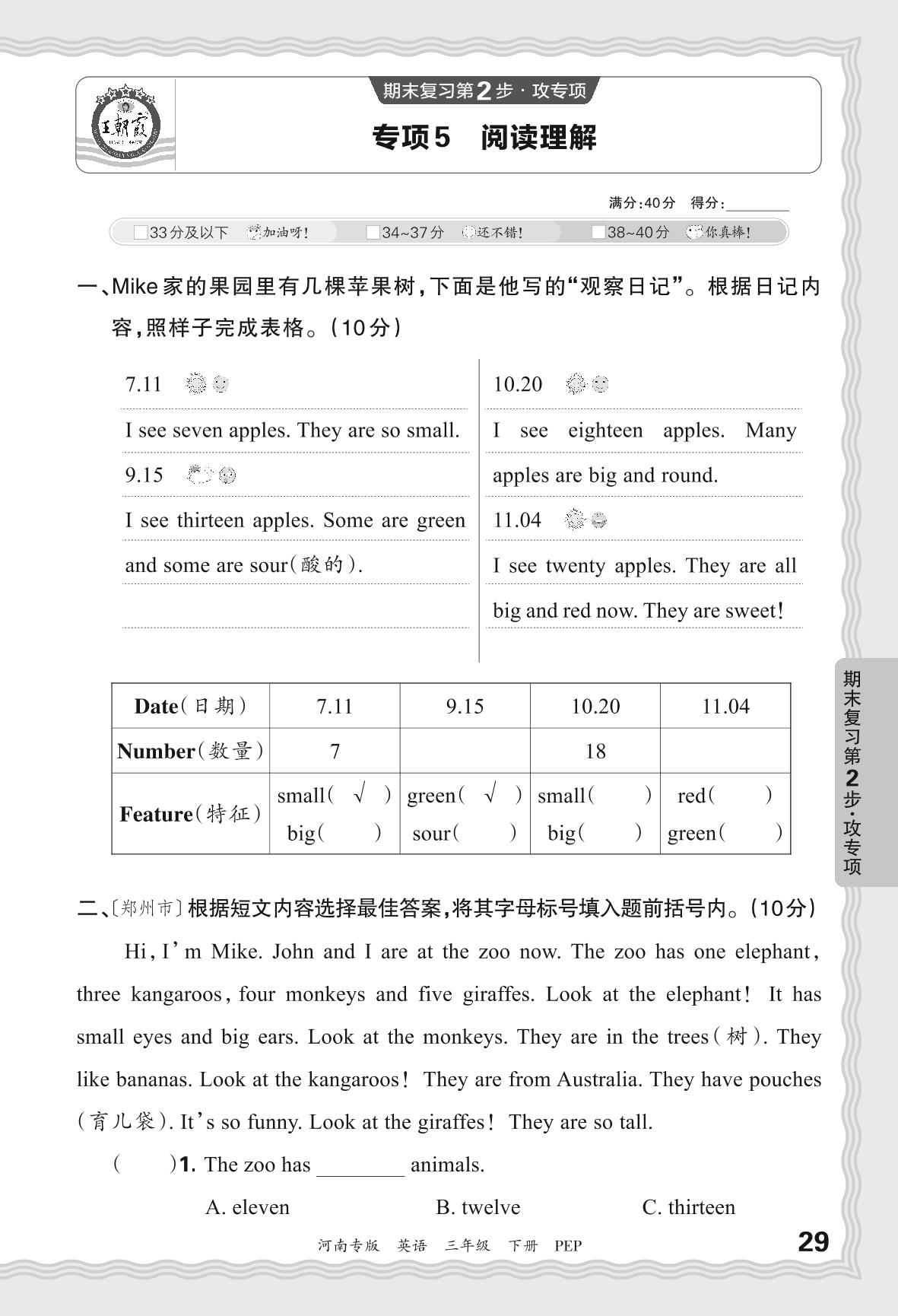 2024春下册三年级英语人教PEP版 期末专项卷河南版·阅读理解