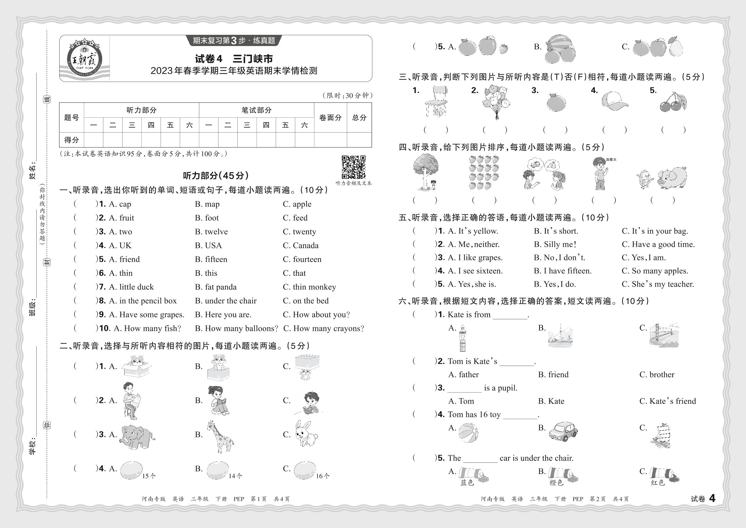 河南省三门峡市2023年春季三年级英语期末学情检测(人教PEP版)【4】