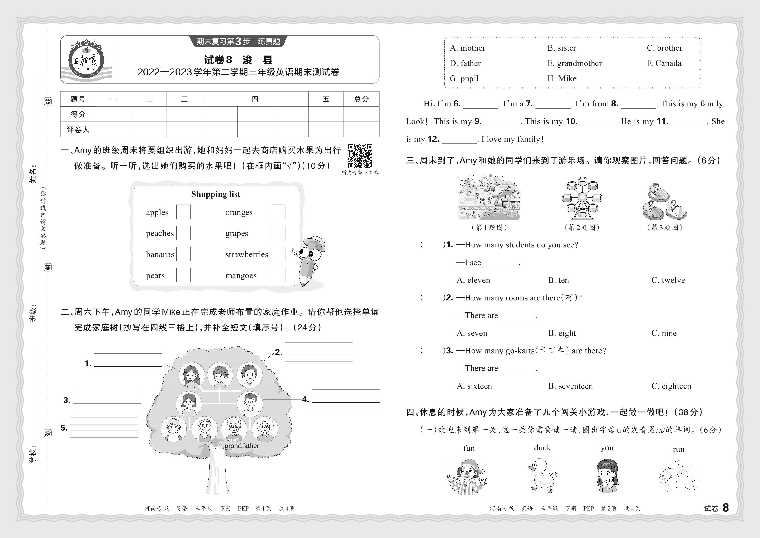 河南省鹤壁市浚县2022—2023学年第二学期三年级英语期末测试试卷(人教PEP版)【8】