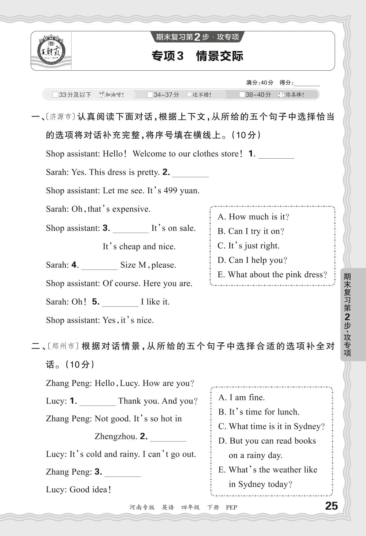 2024春下册四年级英语人教PEP版 期末专项卷河南版·情景交际
