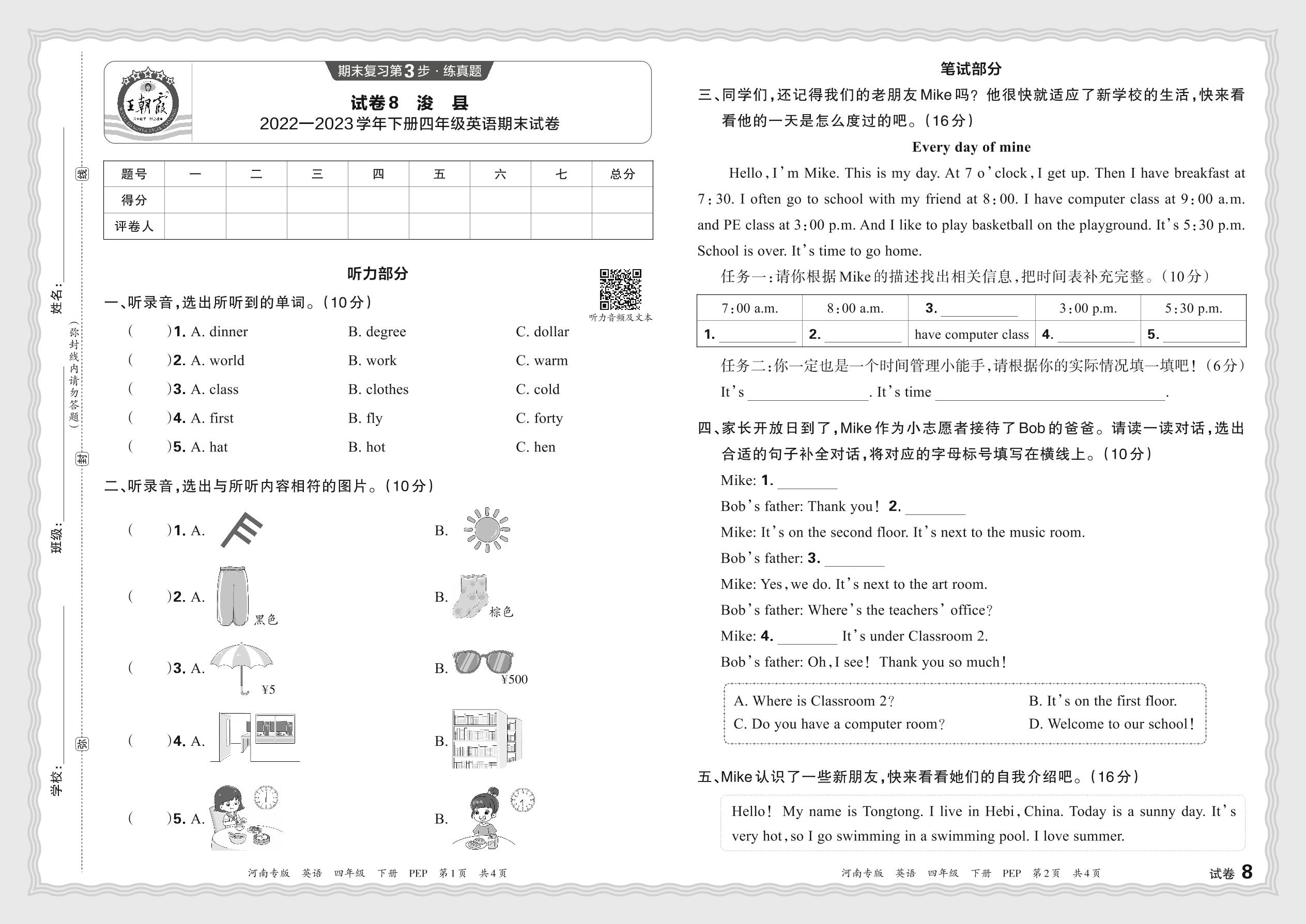 河南省鹤壁市浚县2022—2023学年第二学期四年级英语期末测试试卷(人教PEP版)【8】