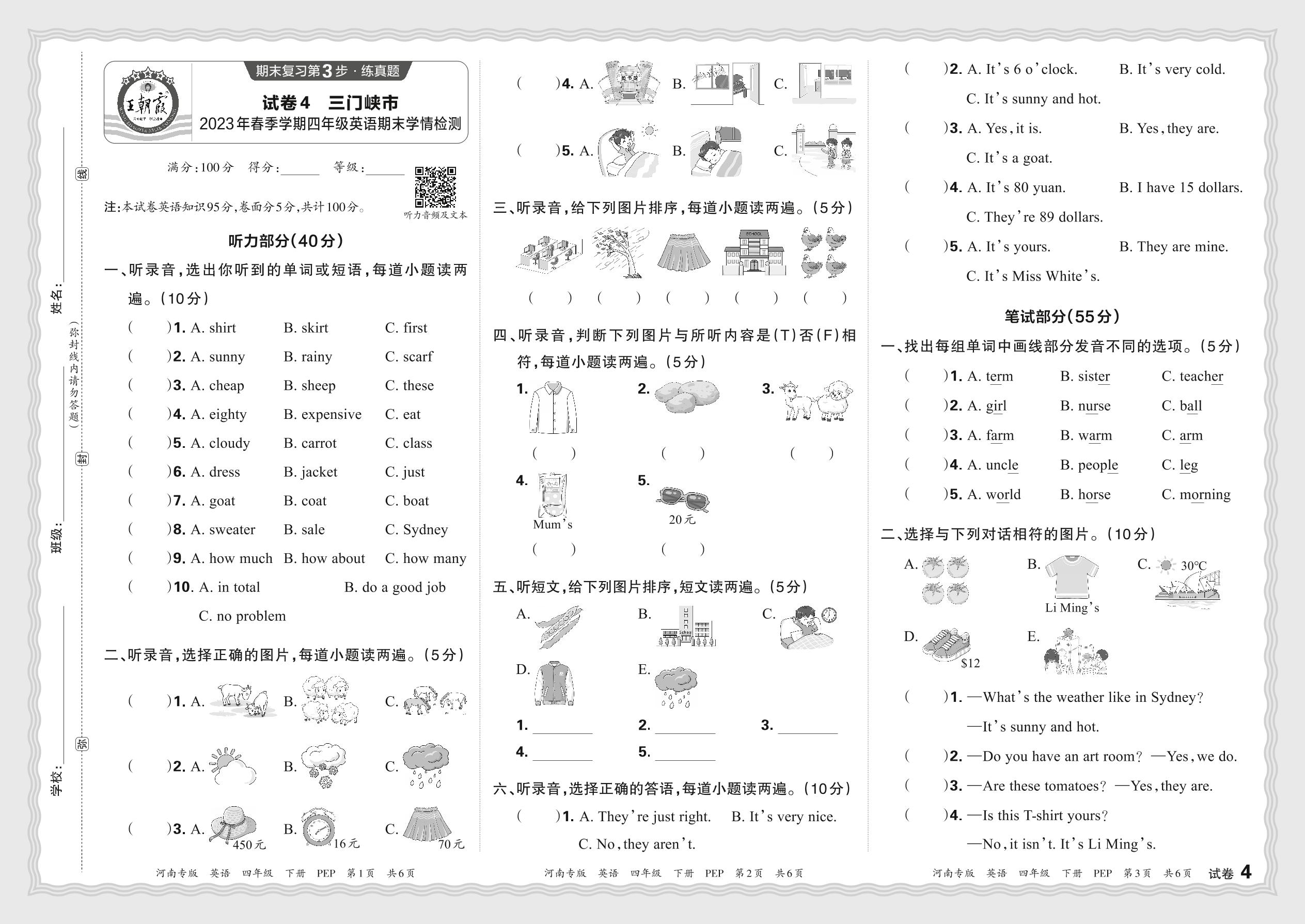 河南省三门峡市2023年春季四年级英语期末学情检测(人教PEP版)【4】