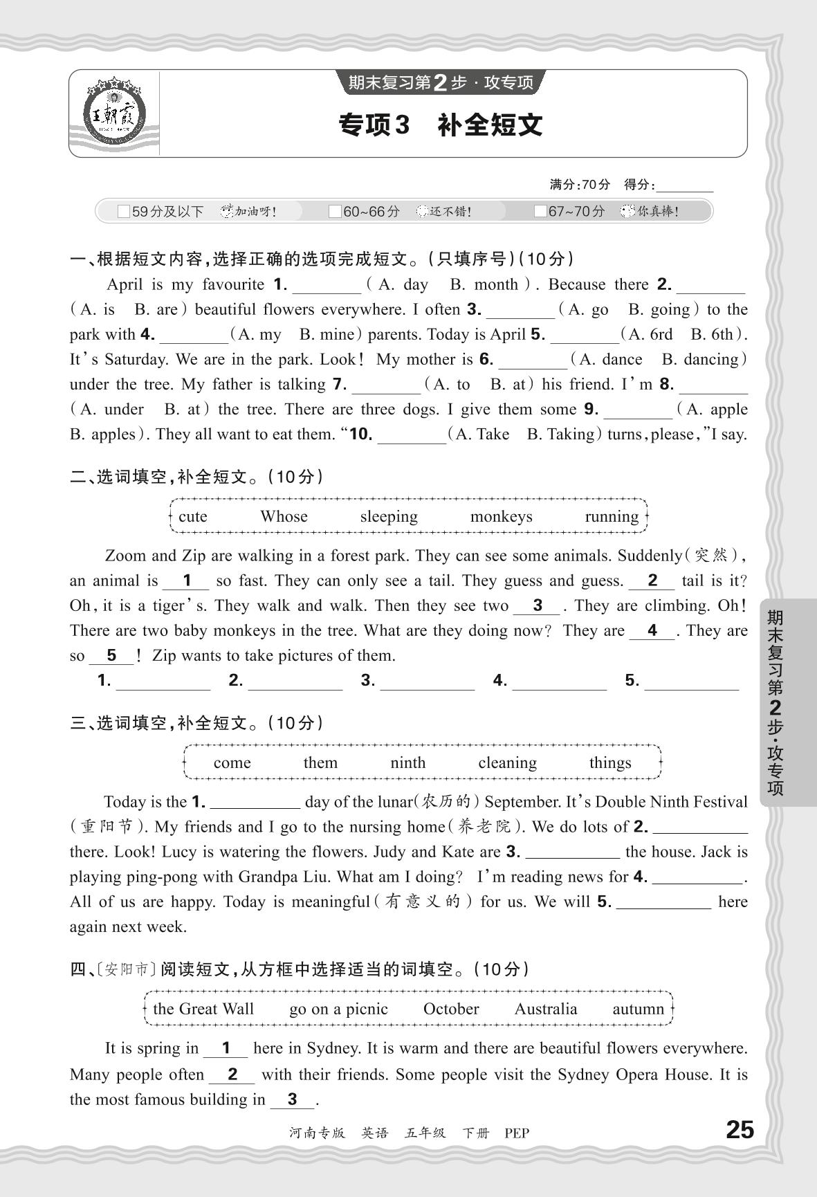 2024春下册五年级英语人教PEP版 期末专项卷河南版·补全短文
