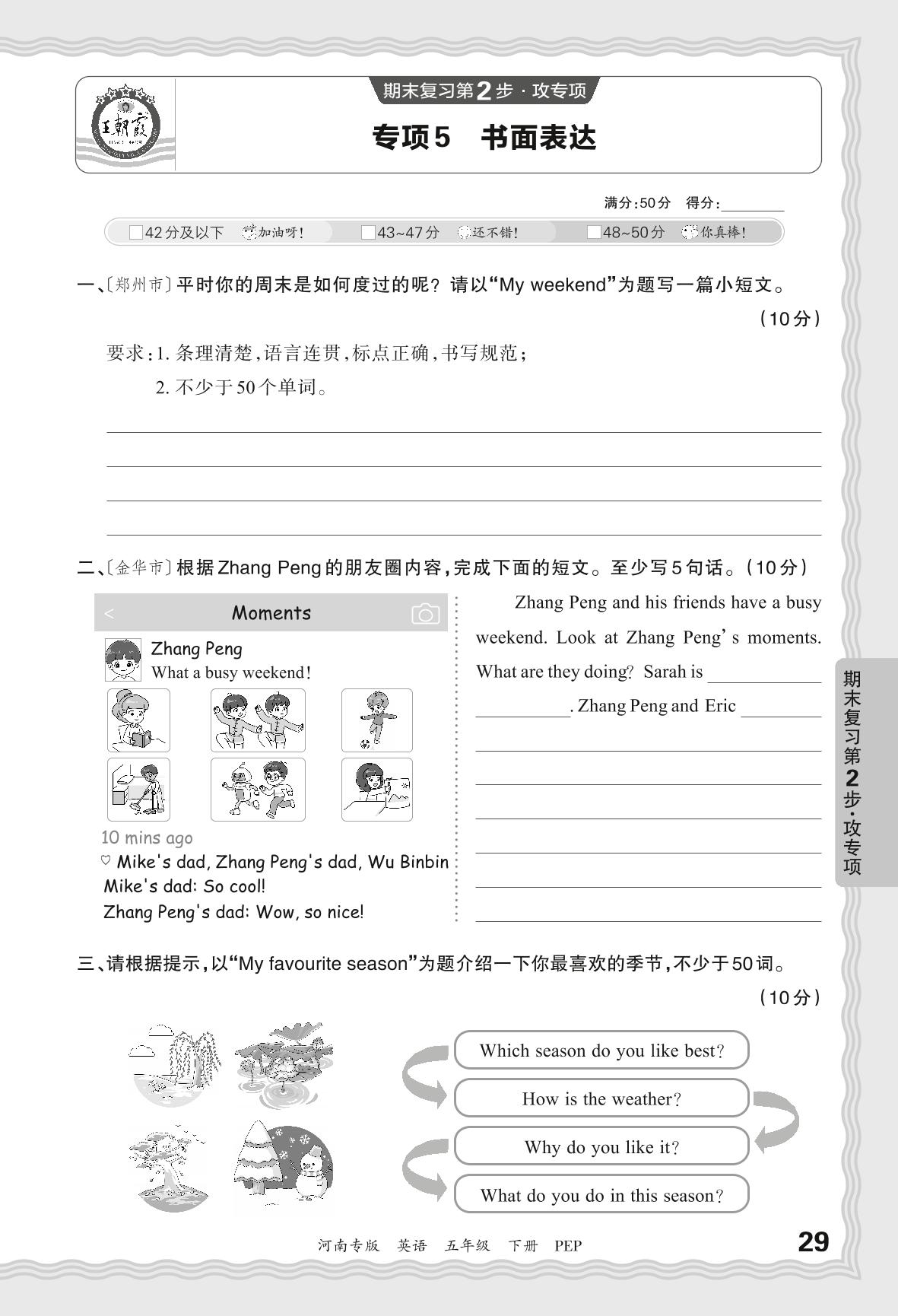 2024春下册五年级英语人教PEP版 期末专项卷河南版·书面表达