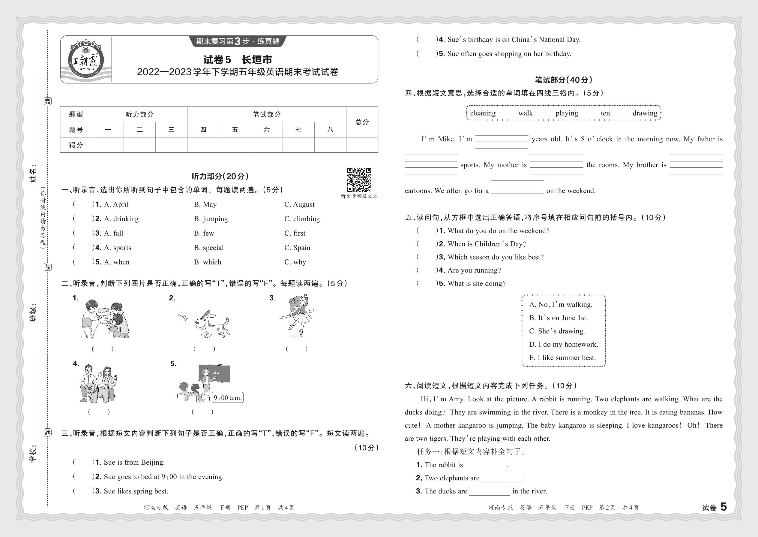 河南省新乡市长垣市2022—2023学年下学期五年级英语期末考试试卷(人教PEP版)【5】