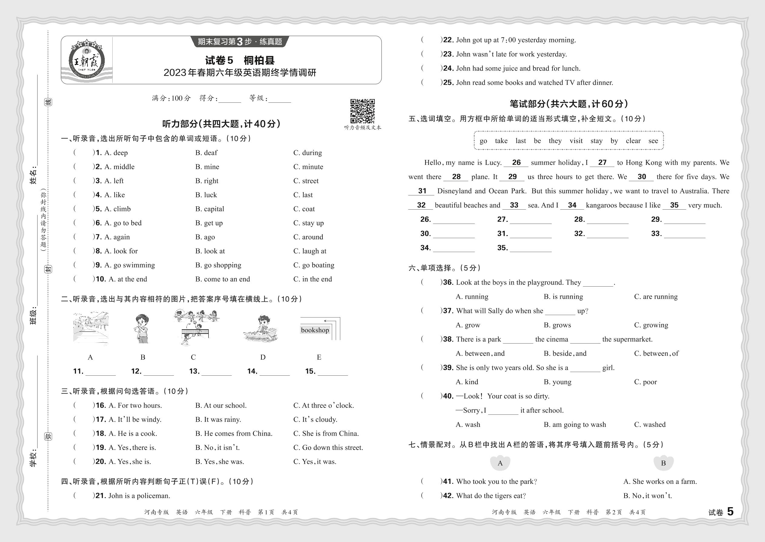 河南省南阳市桐柏县2023年春期六年级英语期终学情调研(科普版)【5】