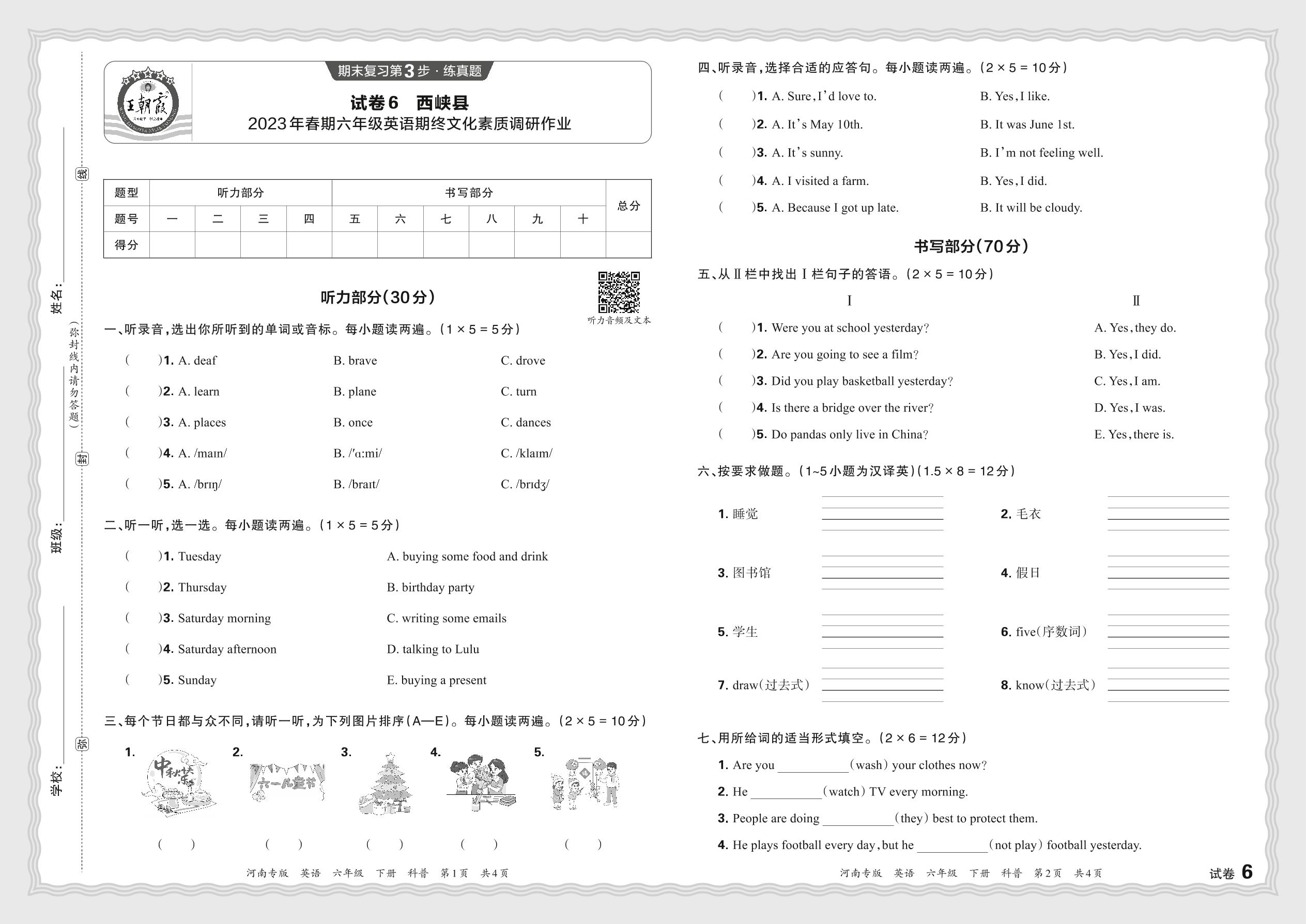河南省南阳市西峡县2023年春期六年级英语期终文化素质调研作业(科普版)【6】