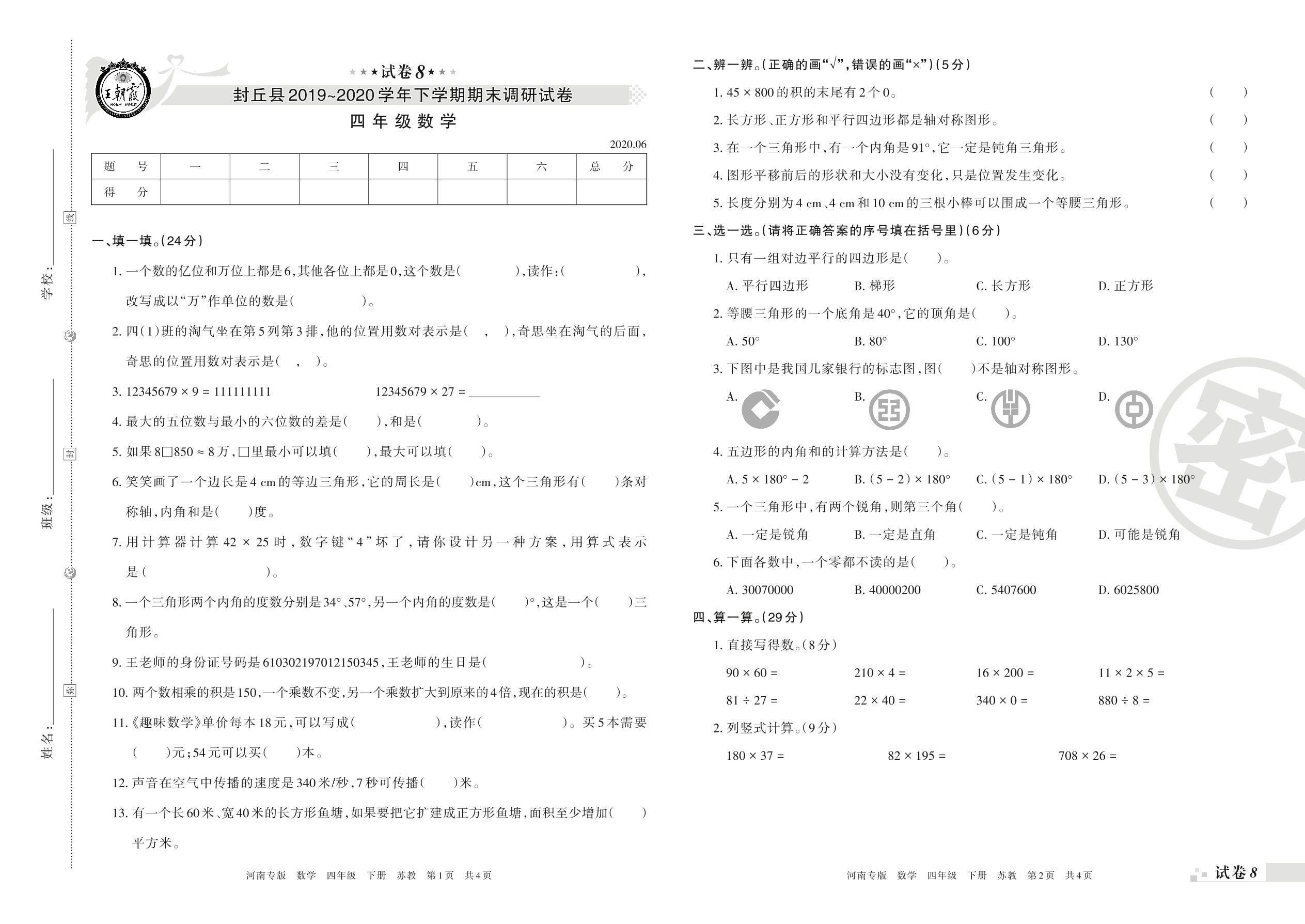 2019-2020学年第二学期新乡市封丘县四年级数学试卷(苏教版)【8】