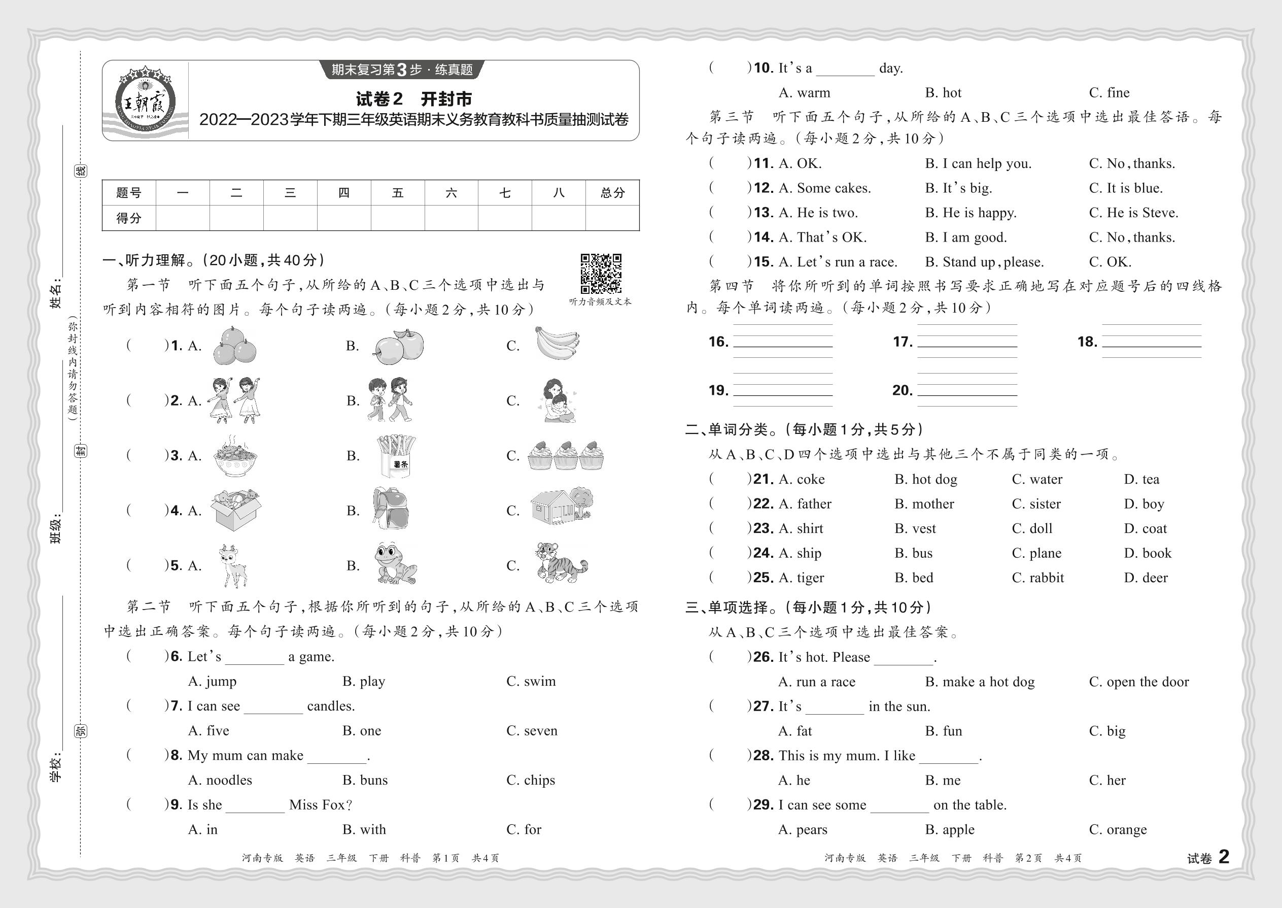 河南省开封市2022—2023学年下期三年级英语期末义务教育教科书质量抽测试卷 (科普版)【2】