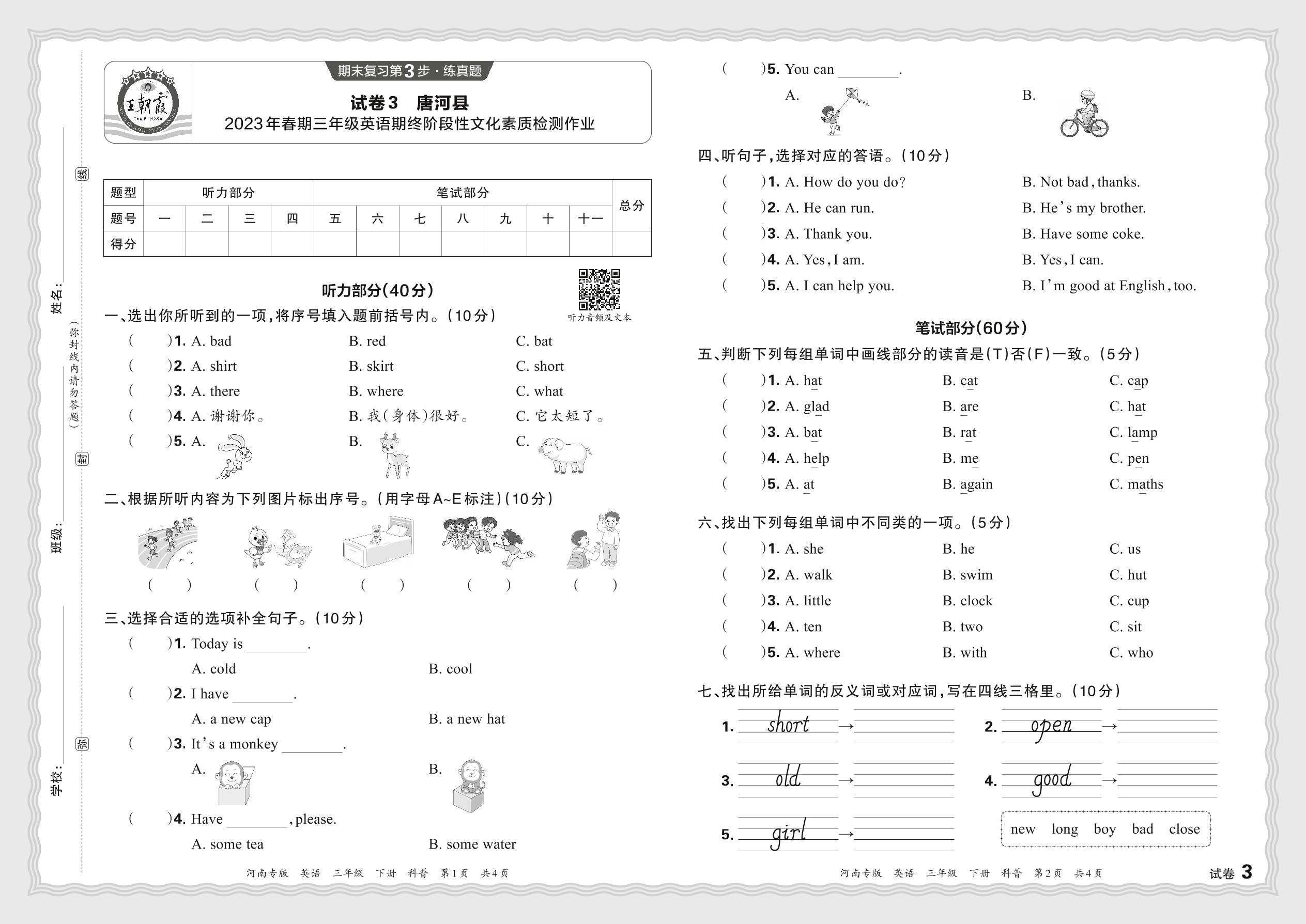 三年级英语科普版下册期末卷