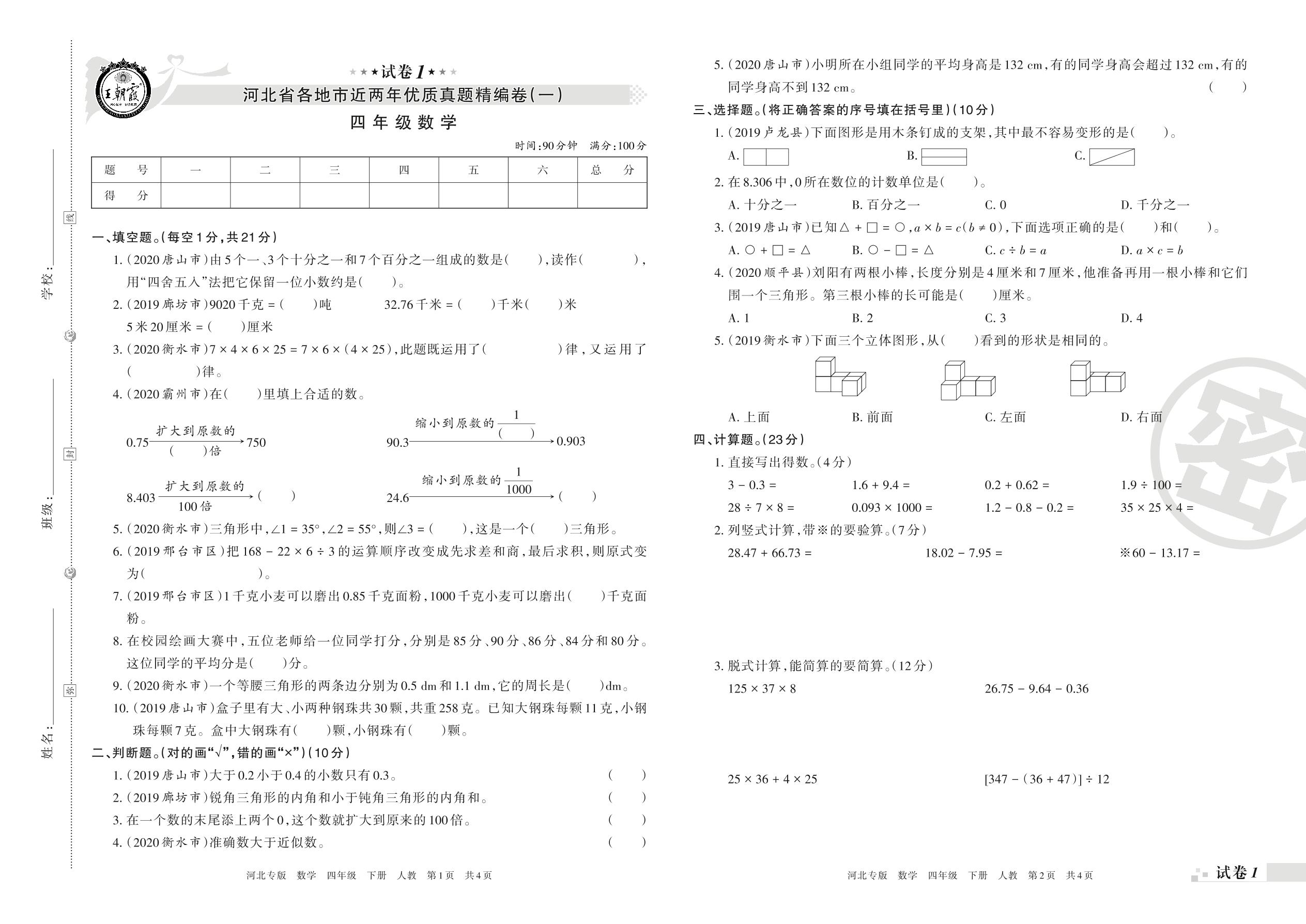 河北省各地市近两年优质真题精编卷(一)四年级下册数学(人教版)【1】