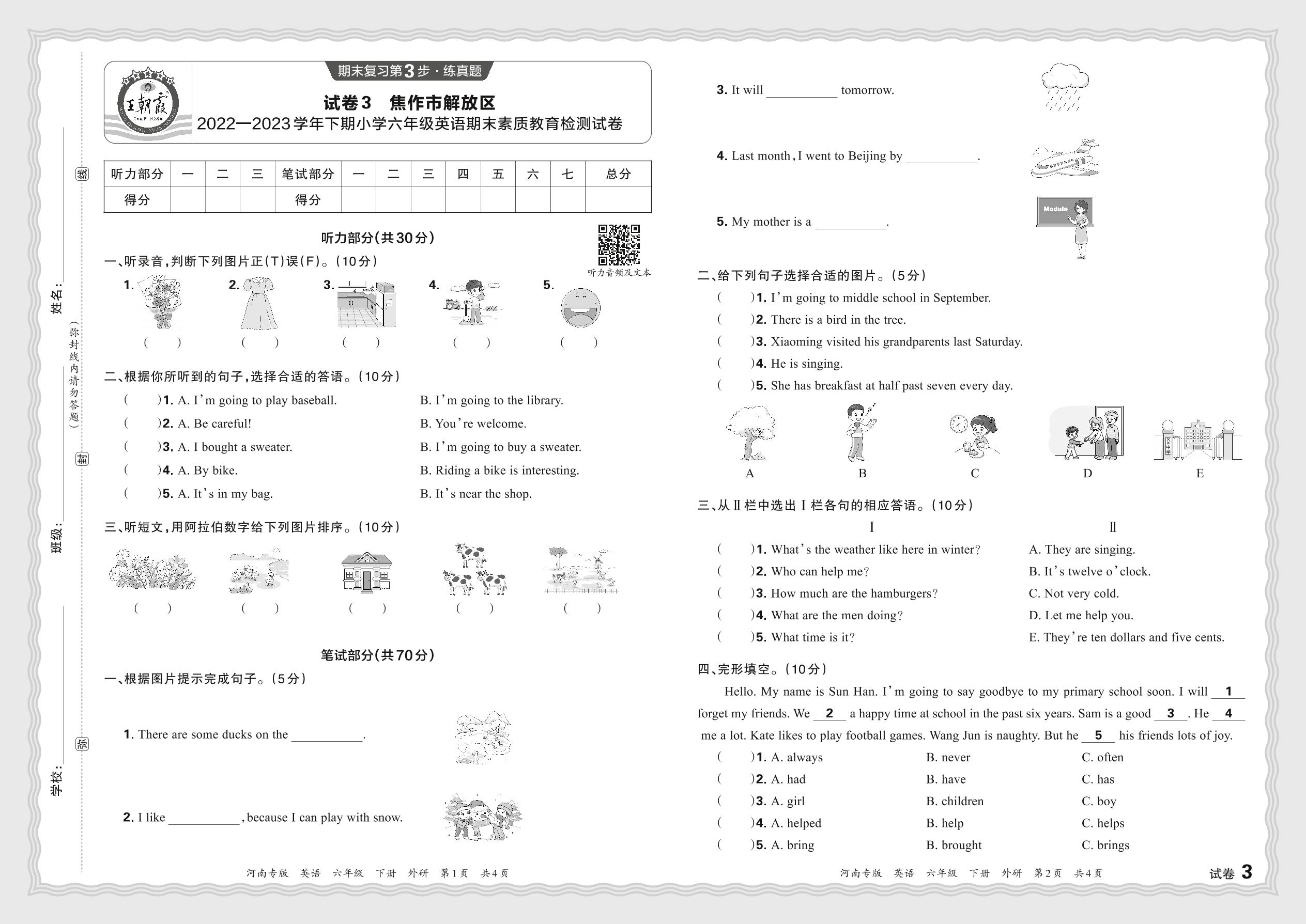 河南省焦作市解放区2022—2023学年下期小学六年级英语期末素质教育检测试卷(外研版)