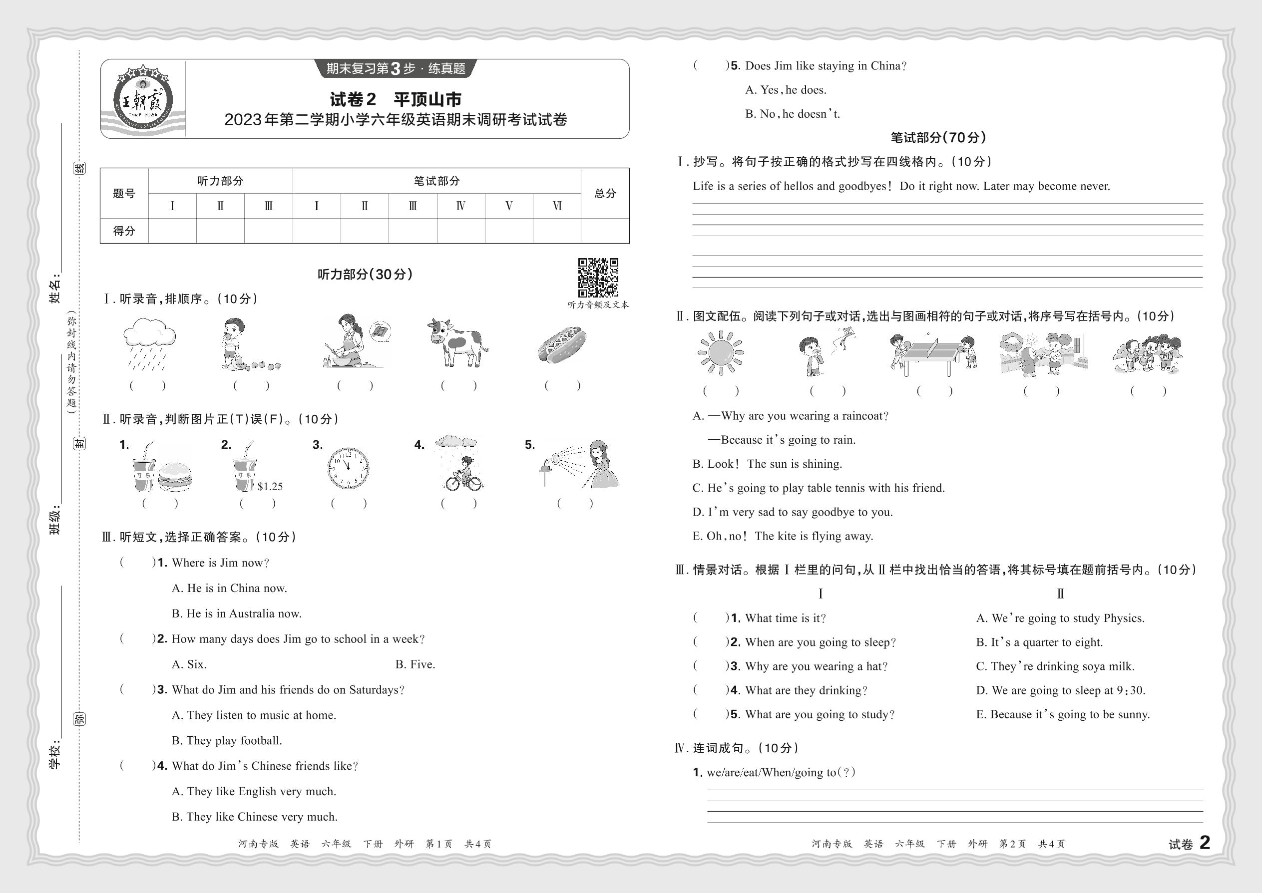 河南省平顶山市2023年第二学期小学六年级英语期末调研考试试卷(外研版)