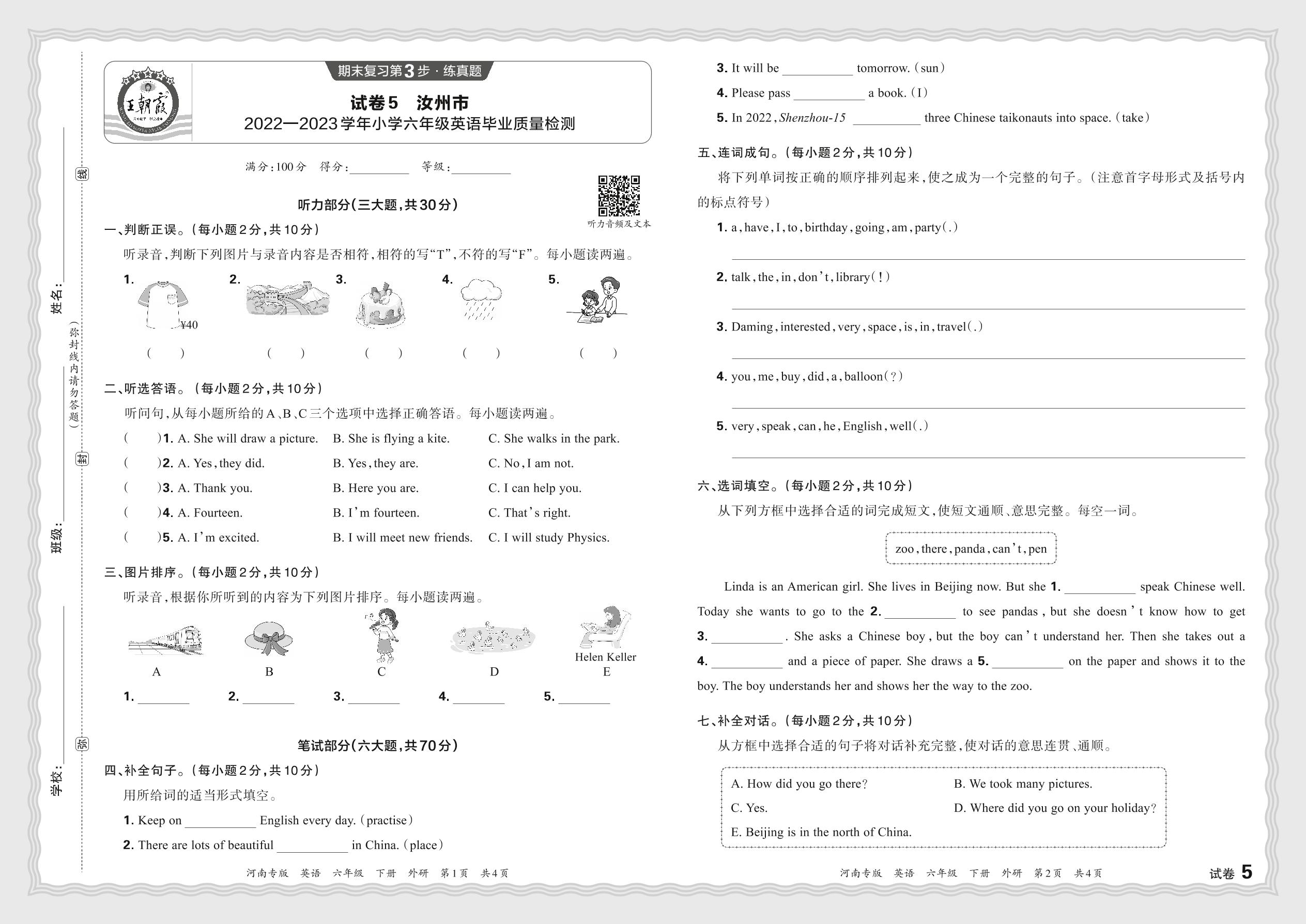 河南省平顶山市汝州市2022—2023学年小学六年级英语毕业质量检测(外研版)