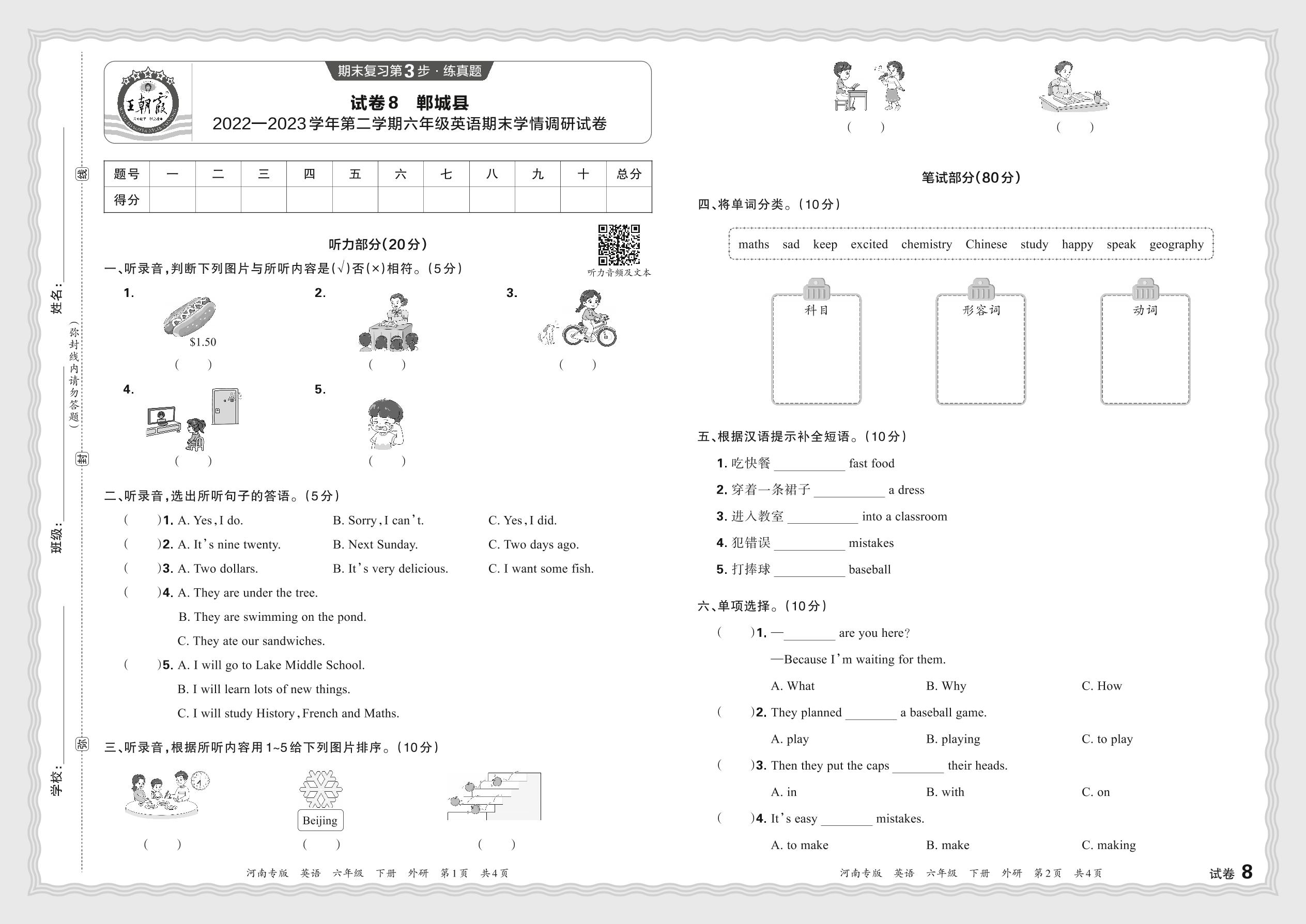 河南省周口市郸城县2022—2023学年第二学期六年级英语期末学情调研试卷(外研版)