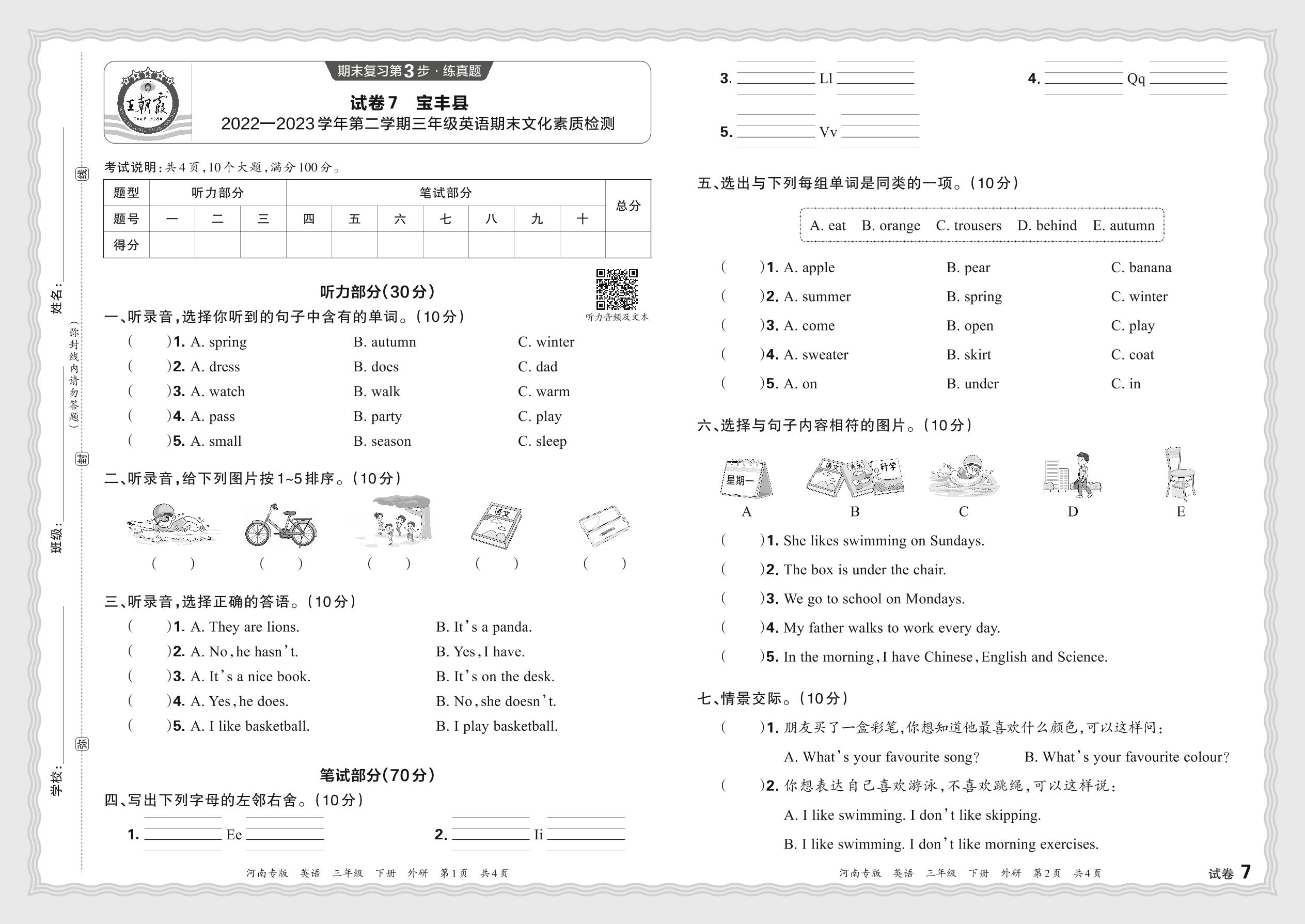 河南省平顶山市宝丰县2022—2023学年第二学期三年级英语期末文化素质检测(外研版)