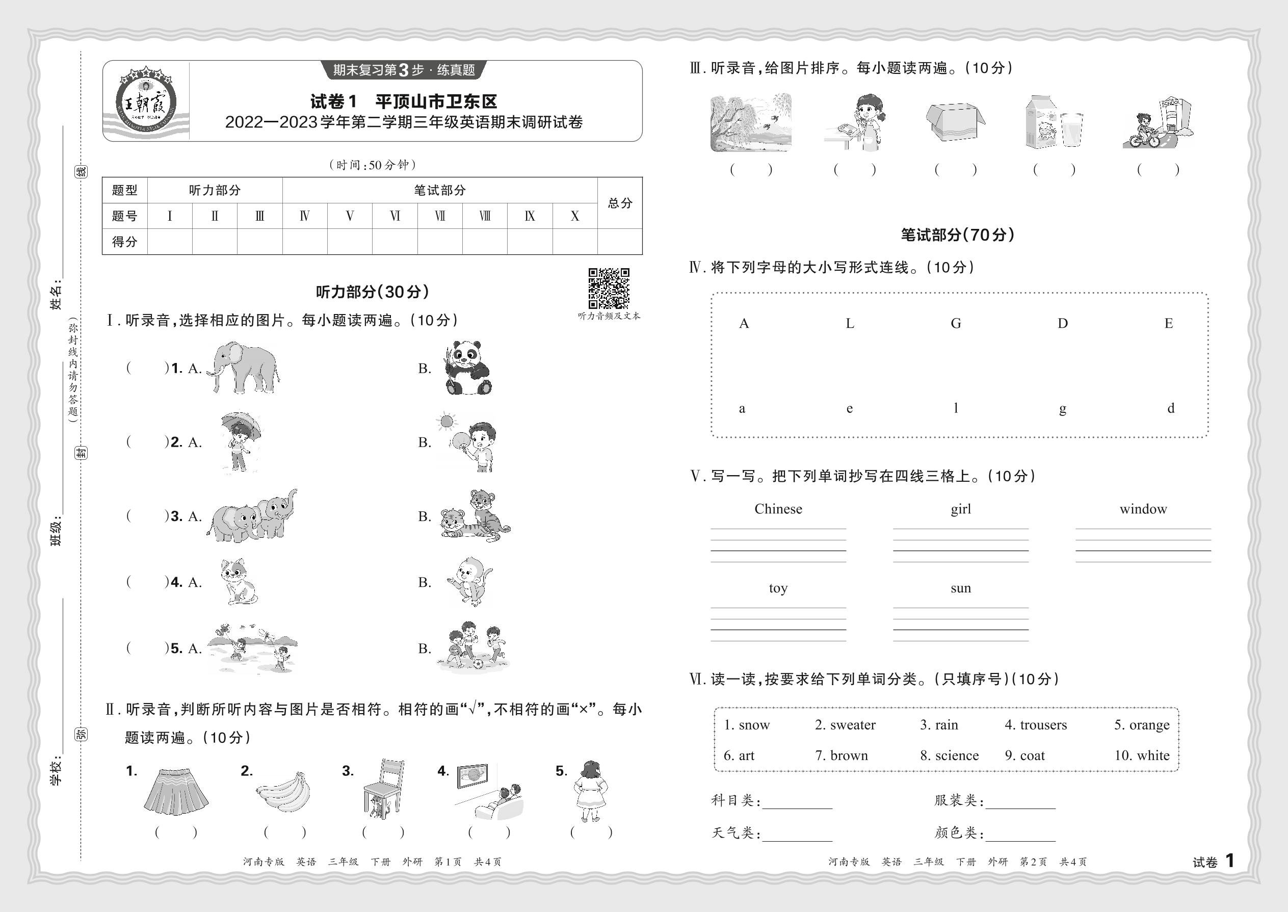 河南省平顶山市卫东区2022—2023学年第二学期三年级英语期末调研试卷(外研版)