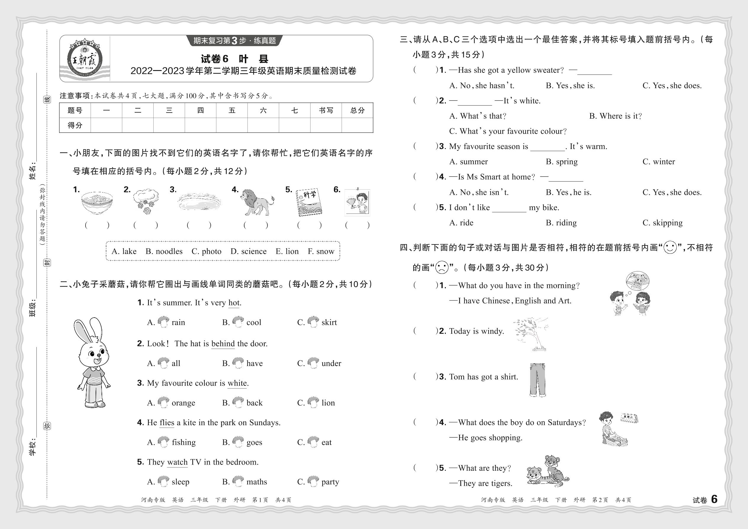 河南省平顶山市叶县2022—2023学年第二学期三年级英语期末质量检测试卷(外研版)