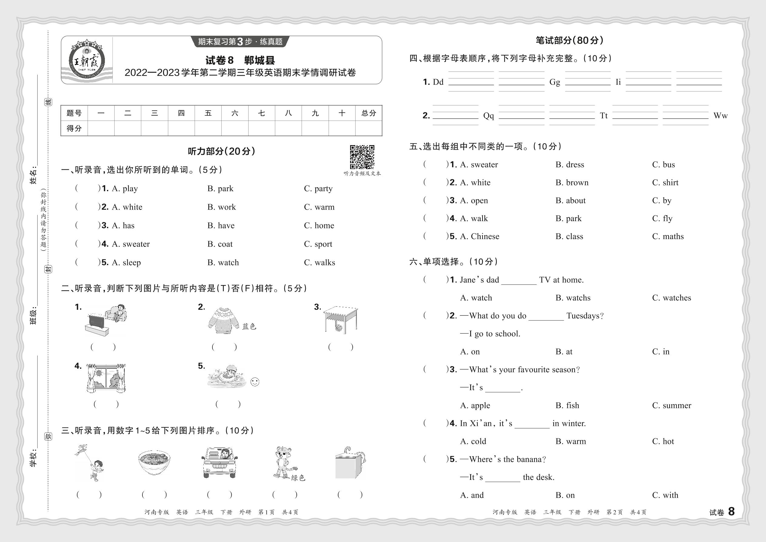 河南省周口市郸城县2022—2023学年第二学期三年级英语期末学情调研试卷(外研版)