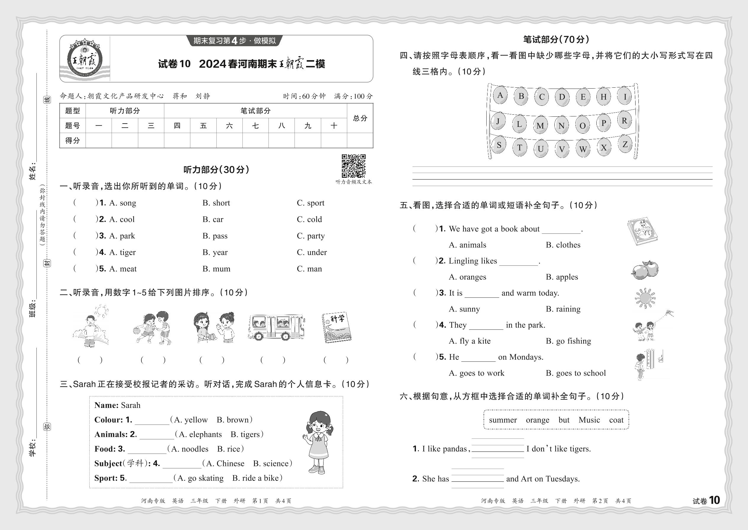 2024春下册三年级英语外研版 河南期末王朝霞二模