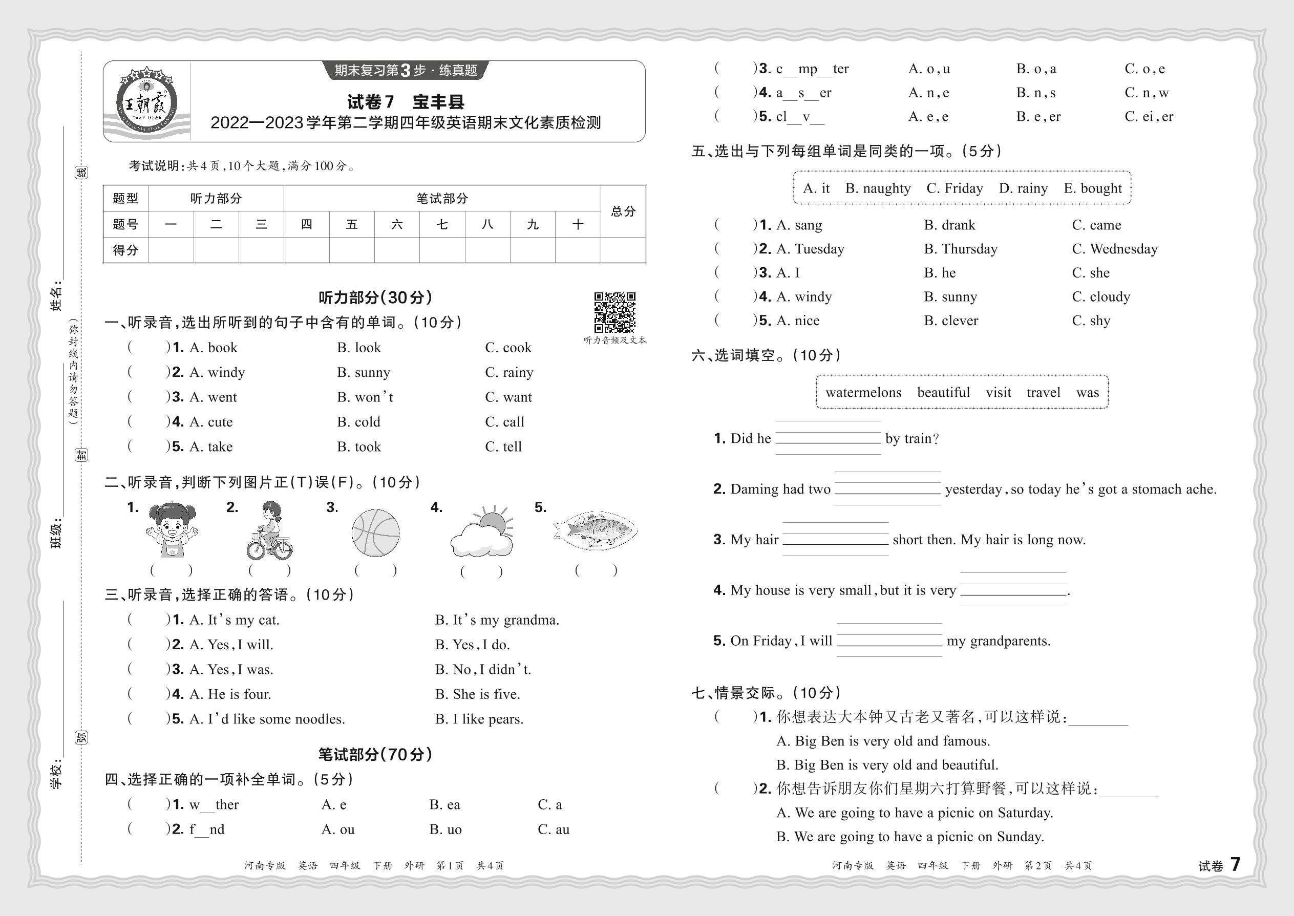 河南省平顶山市宝丰县2022—2023学年第二学期四年级英语期末文化素质检测(外研版)【7】