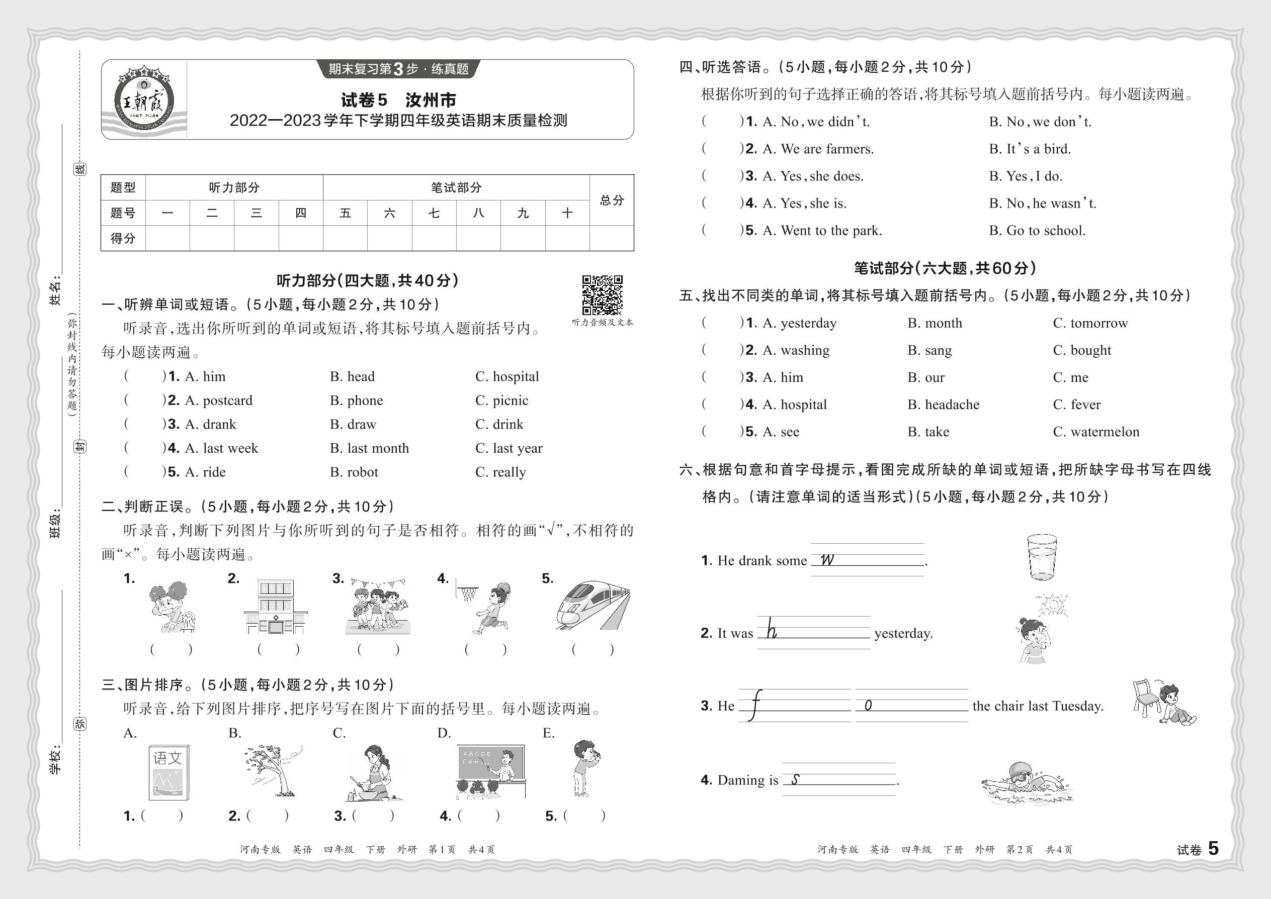 河南省平顶山市汝州市2022—2023学年下学期四年级英语期末质量检测(外研版)【5】