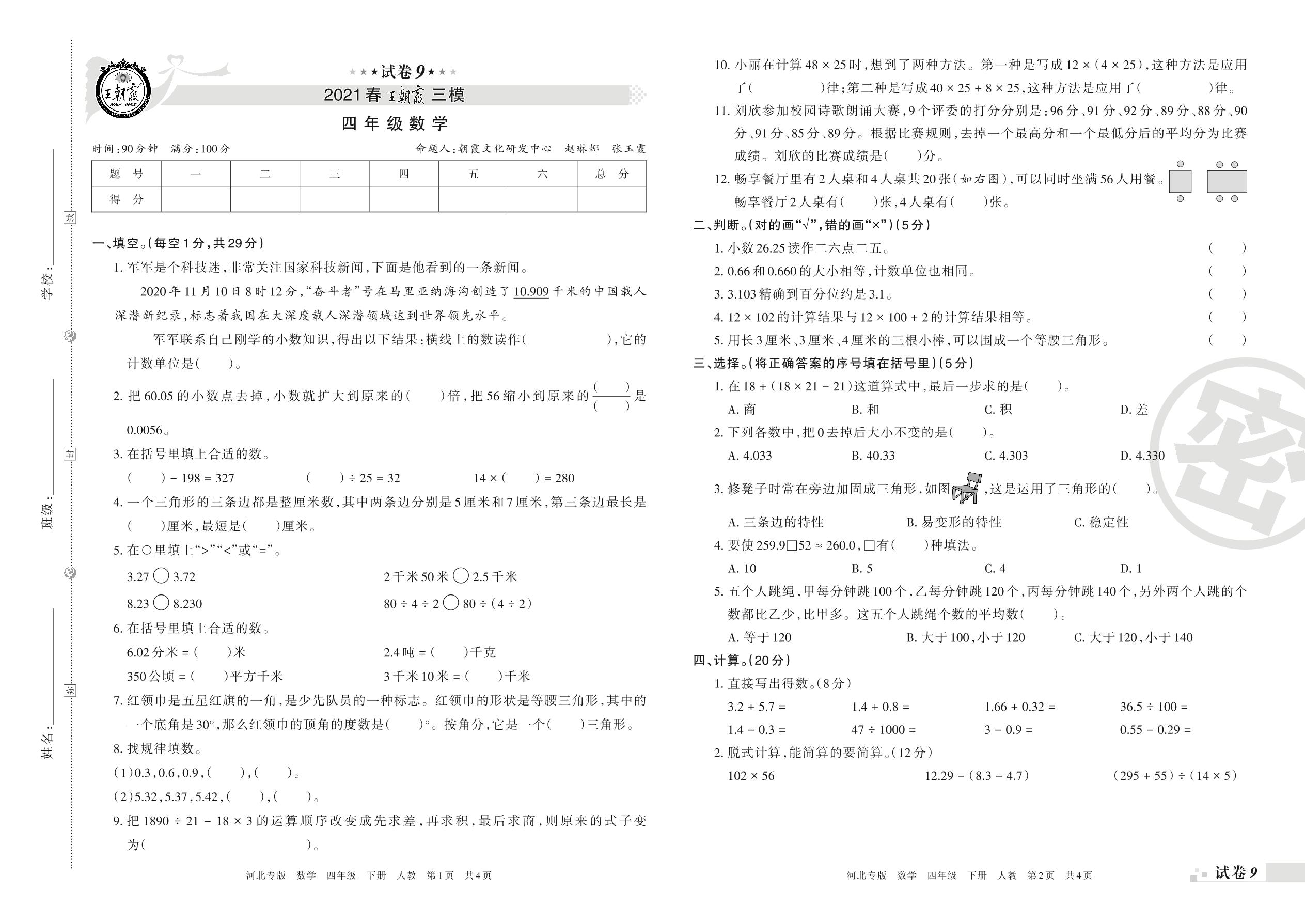 王朝霞期末模拟卷四年级下册数学(人教版)_R210804135429【9】